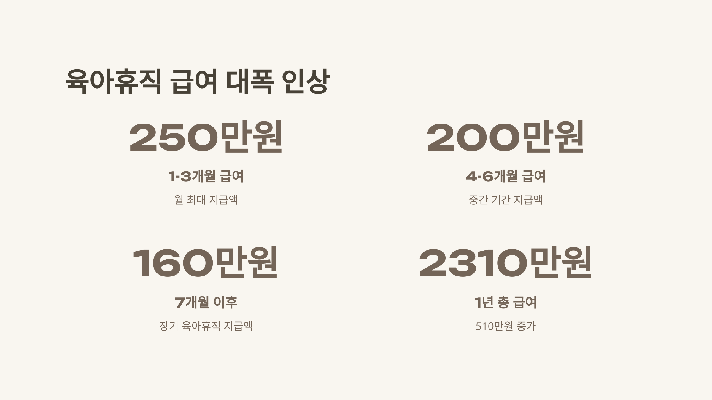 이렇게 되면 1년 동안 육아휴직을 쓸 경우, 총급여가 무려 2310만 원! 510만 원이나 늘어난 거죠. 제 친구 중에 육아휴직을 고민하던 부부가 있었는데, 이 소식을 듣고 결심을 굳혔다고 하더라고요.