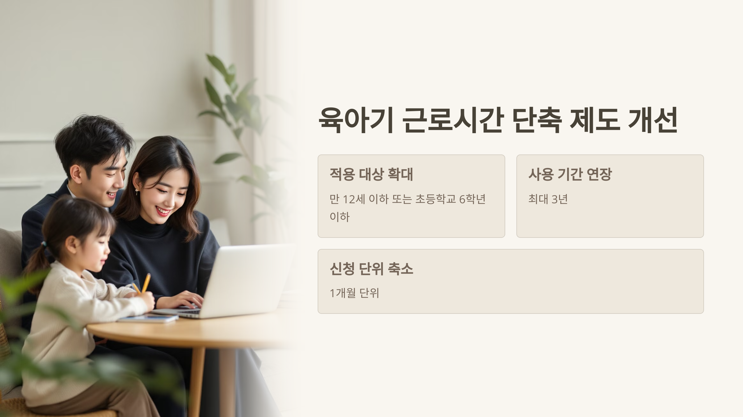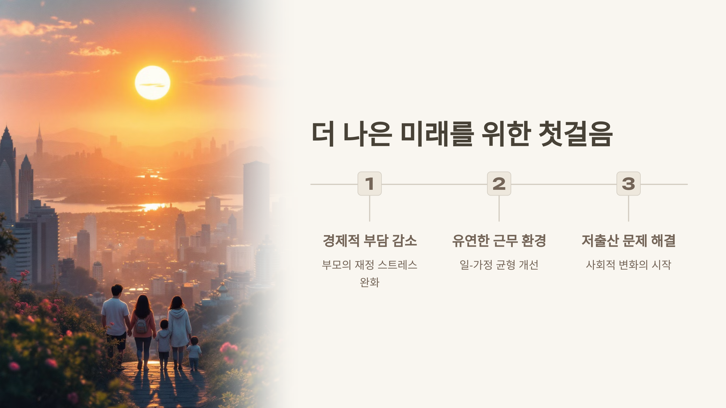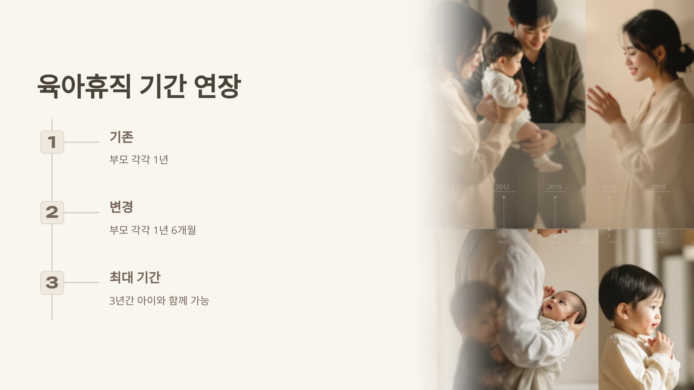 최대 3년간 아이와 함께할 수 있게 된 거예요. 아이의 중요한 성장 시기에 부모가 곁에 있을 수 있다는 건 정말 값진 변화 같아요.