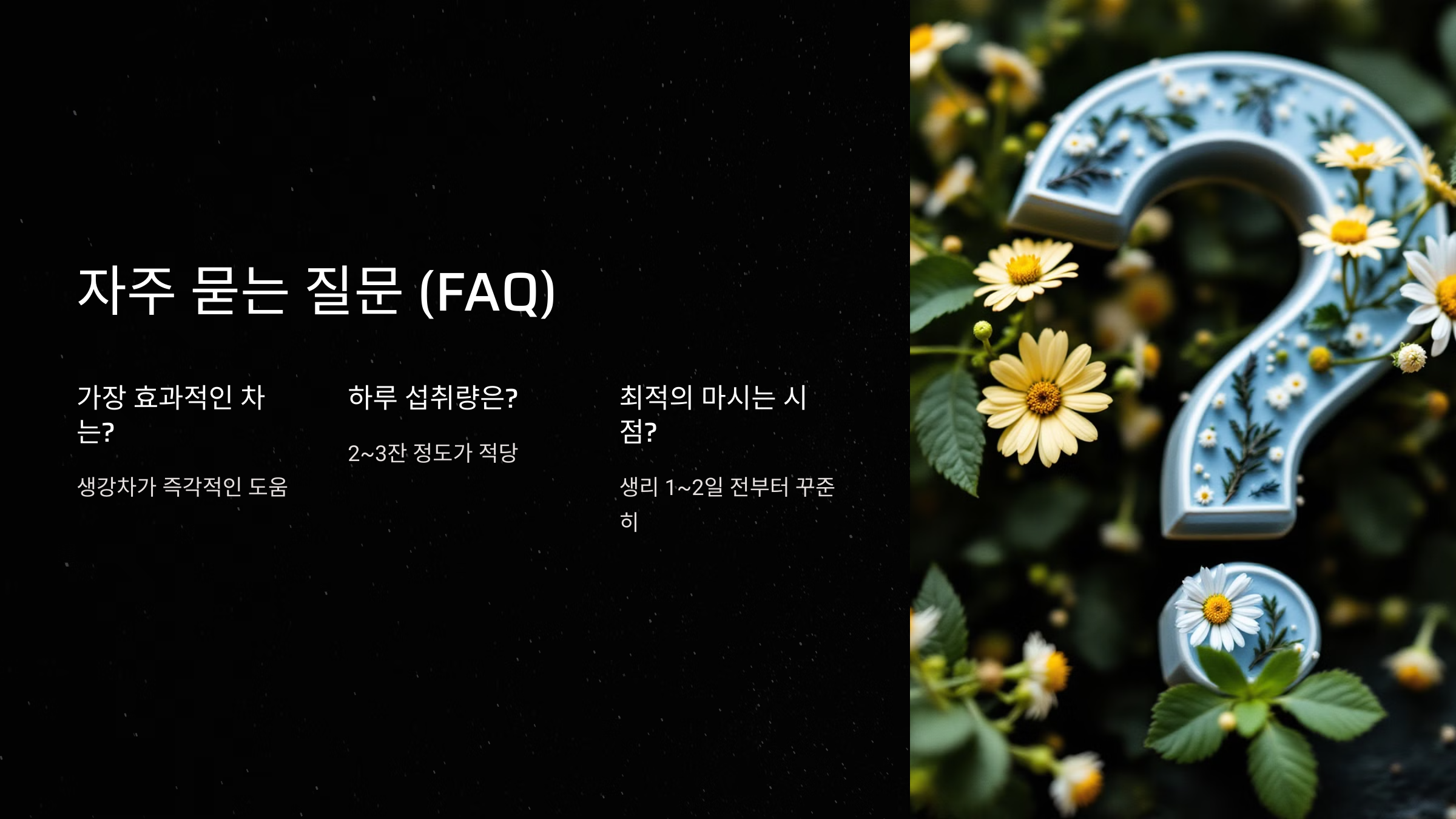 A1. 개인마다 다르지만, 생강차는 강력한 항염 작용으로 생리통이 심한 날에 즉각적인 도움을 줄 수 있습니다.