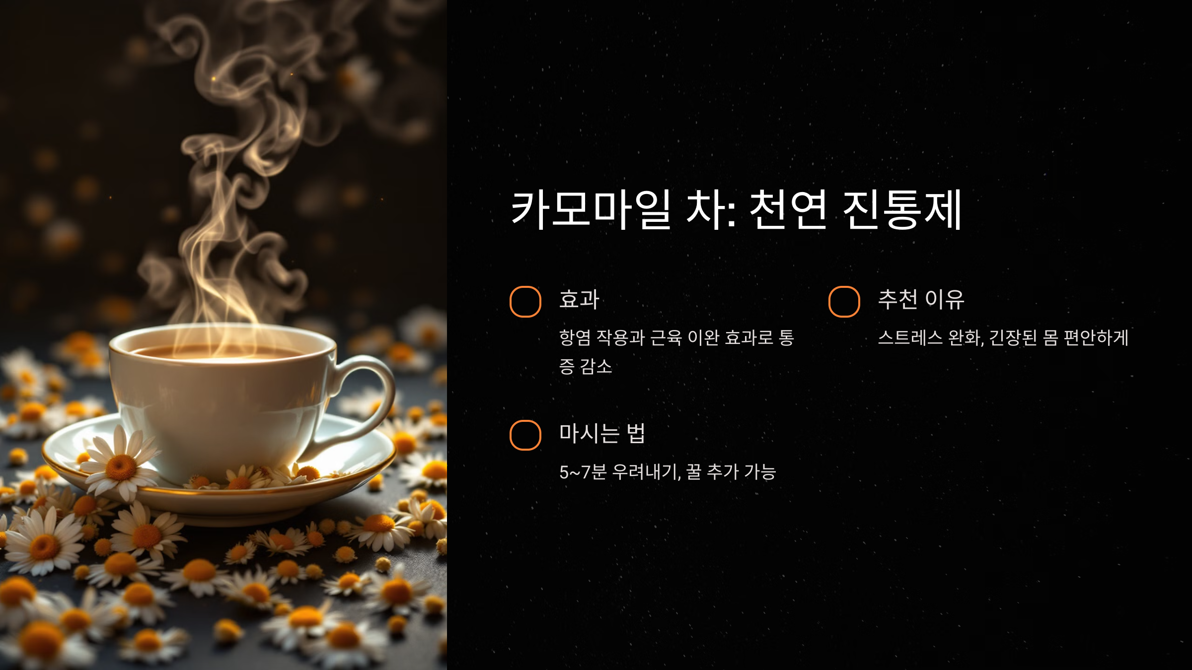 💡 Tip: 자기 전 카모마일 차를 마시면 숙면에도 도움을 줍니다.