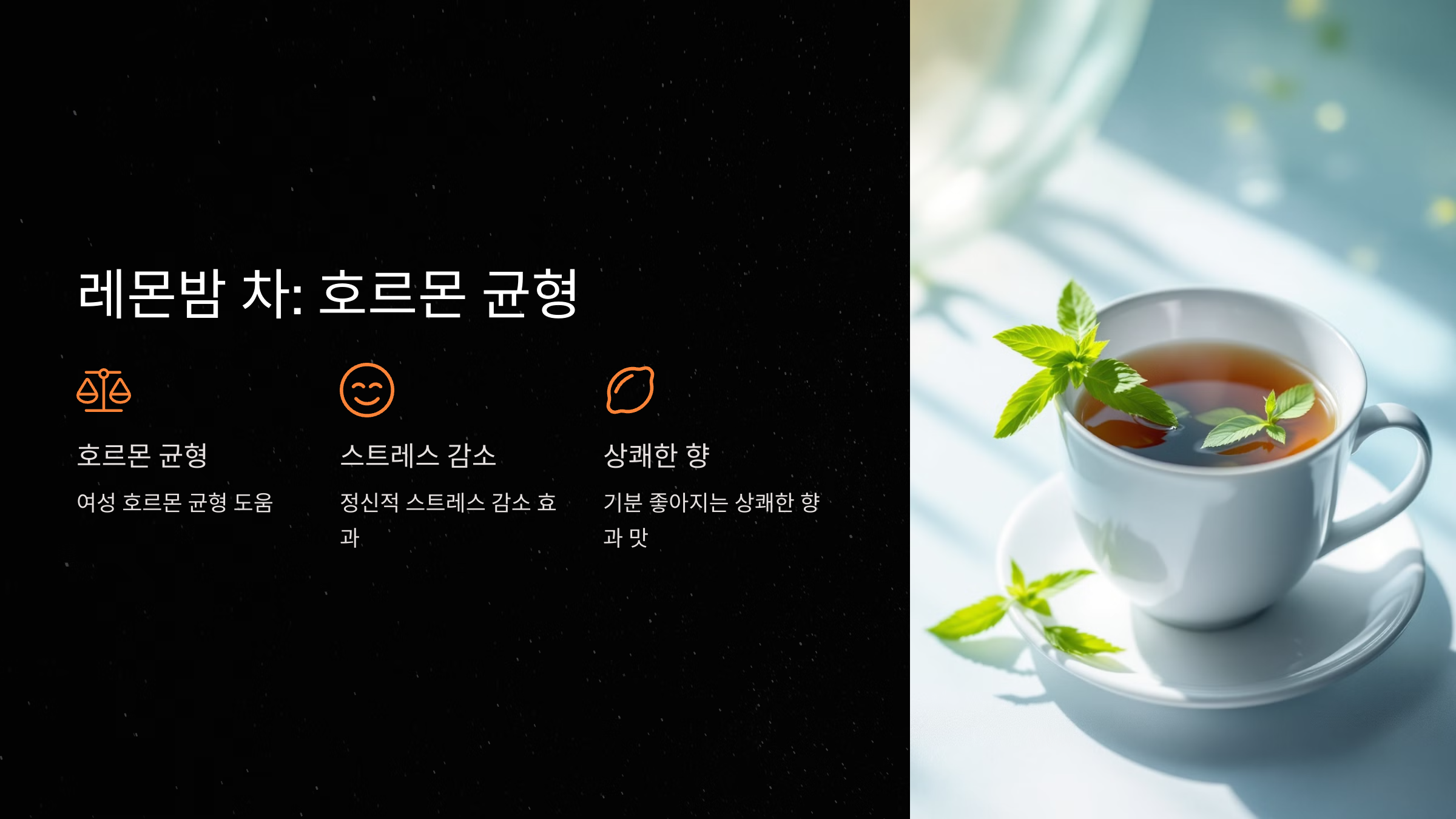레몬밤 차는 여성 호르몬 균형을 돕는 차로, 생리통을 줄이고 기분을 안정시켜 줍니다.