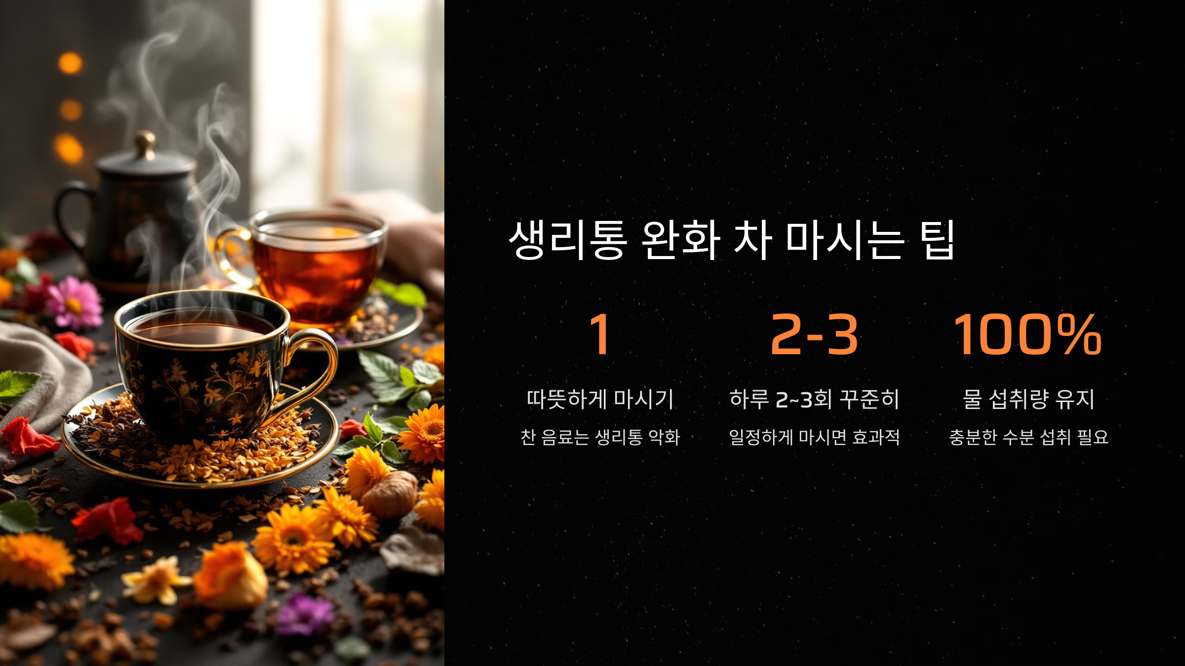 1️⃣ 따뜻하게 마시기: 찬 음료는 생리통을 악화시킬 수 있으니, 항상 따뜻한 상태로 마시세요.