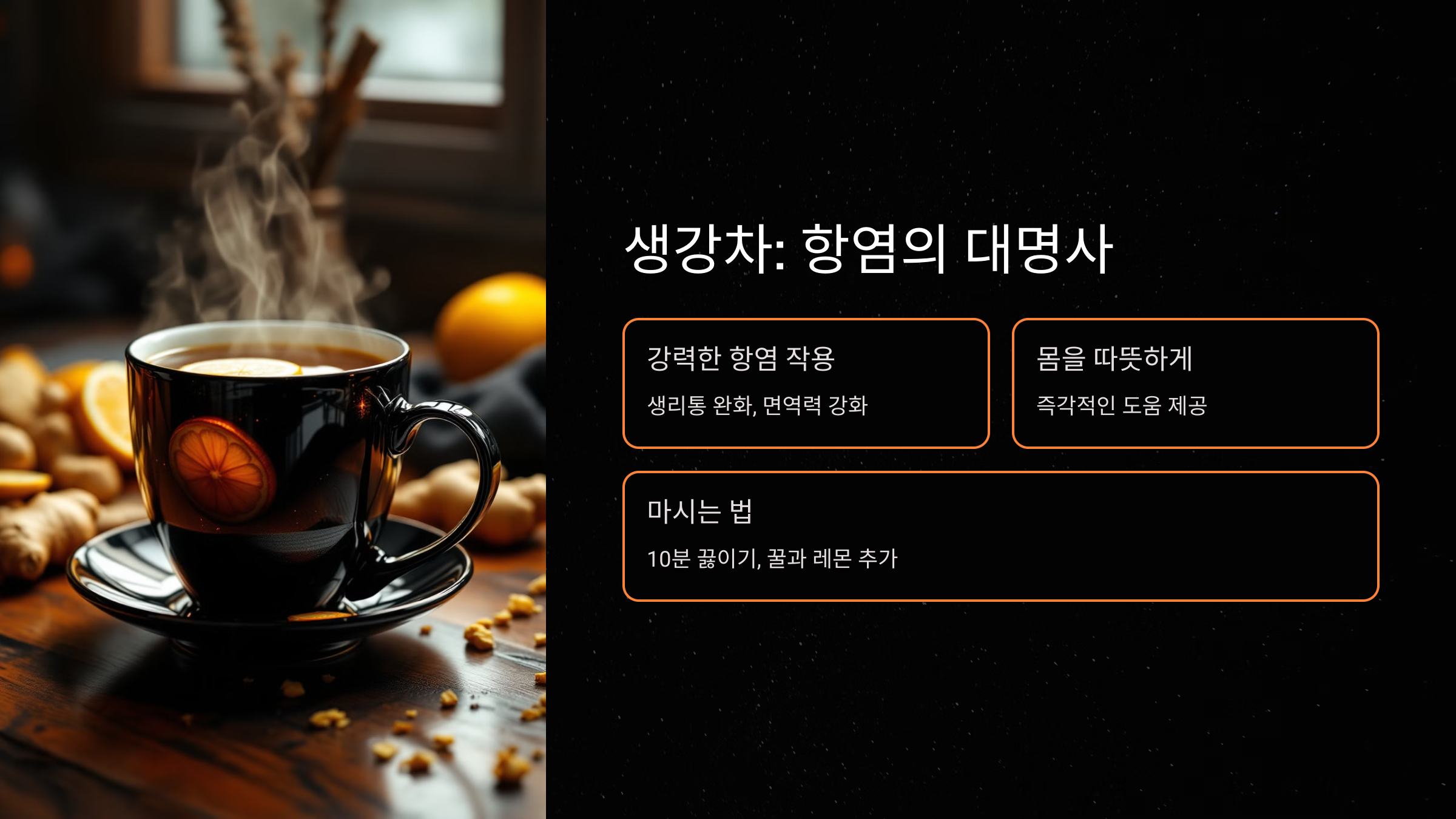 💡 Tip: 생리통뿐 아니라 감기 증상에도 유용하니 생강차를 상비해 두세요!