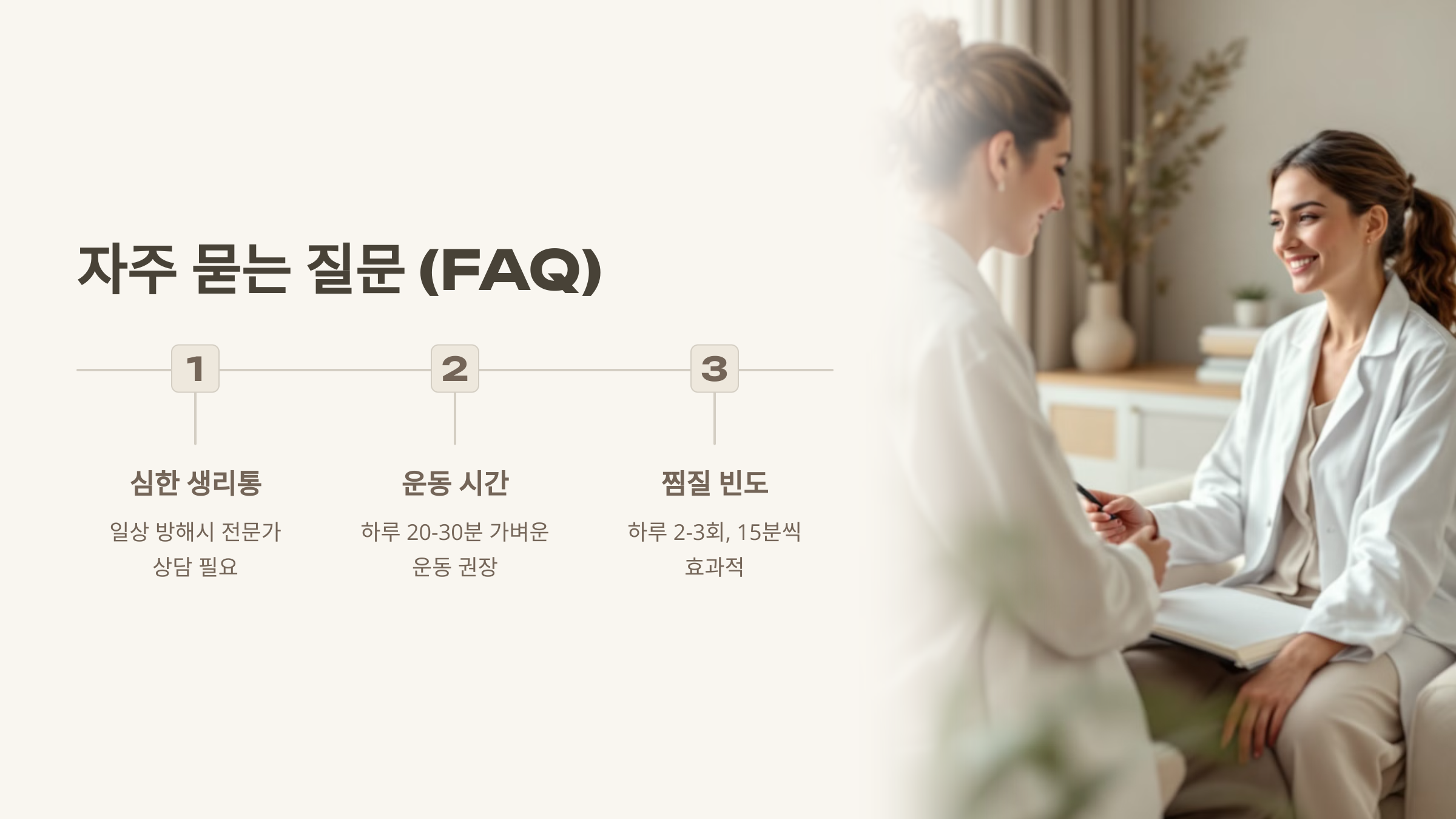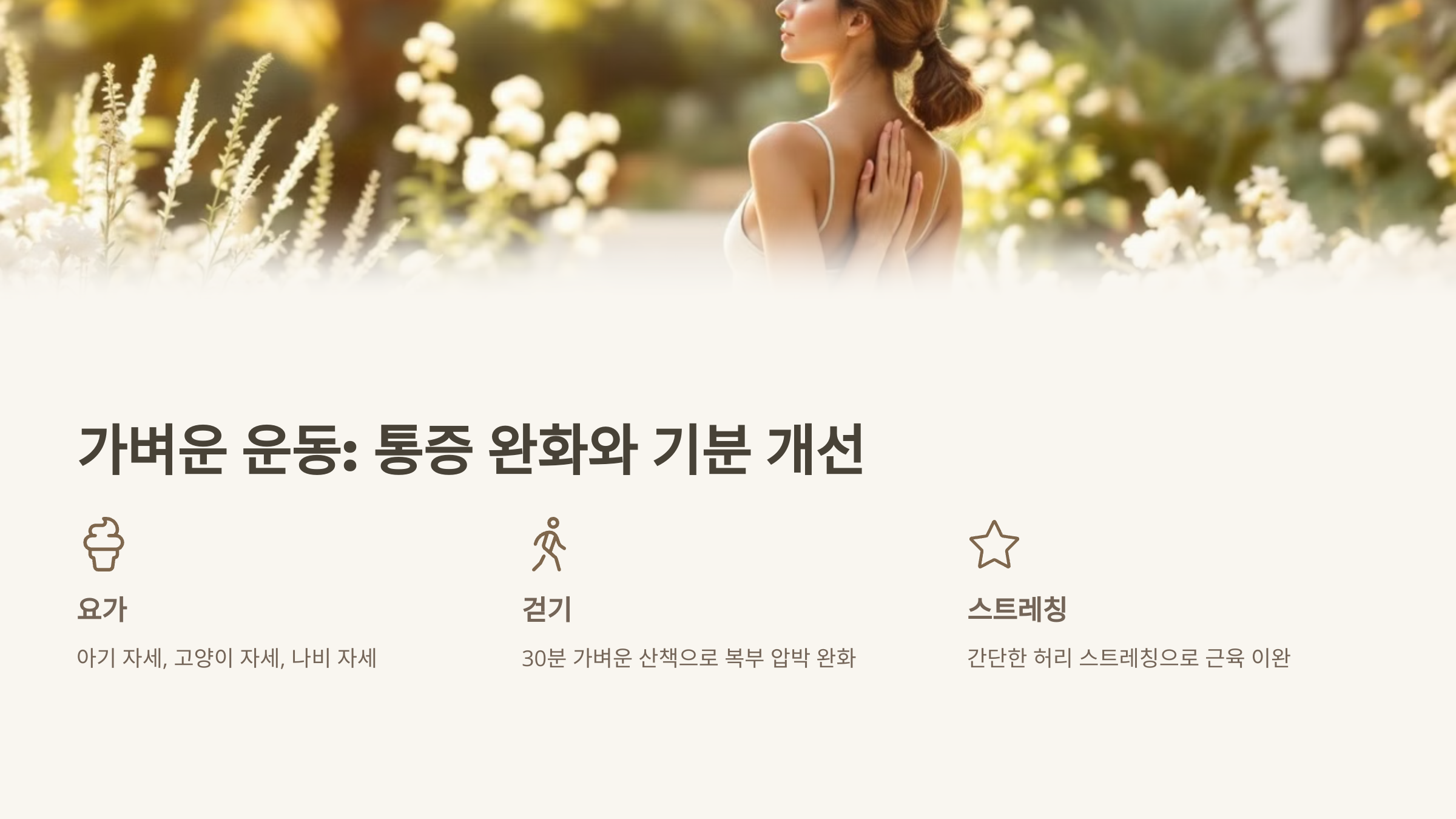 💡 Tip: 생리통이 심할 때는 강도 높은 운동 대신 부드럽게 몸을 움직이는 것이 중요합니다.