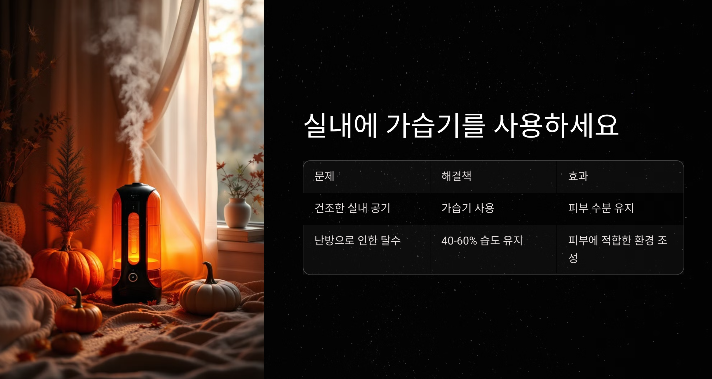 난방 시스템이 작동하면 실내 공기가 매우 건조해져 피부가 탈수되고 각질이 생길 수 있습니다. 침실이나 작업 공간에 가습기를 두고 공기에 수분을 더해주면 피부가 촉촉하게 유지됩니다. 실내 습도를 40-60%로 유지하면 피부에 적합한 환경을 조성할 수 있습니다.