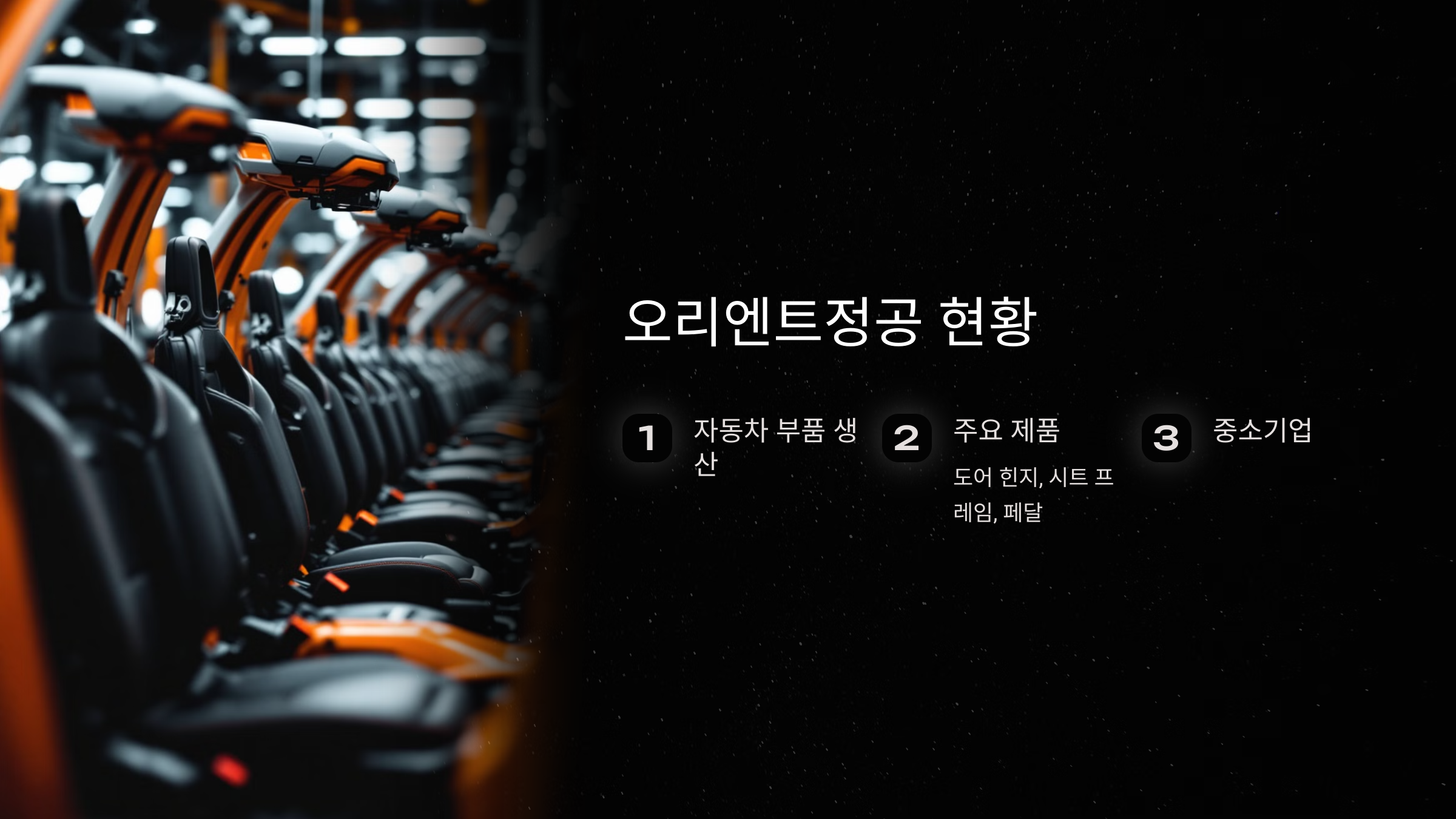 오리엔트정공은 자동차 부품을 주로 생산하는 중소기업입니다. 주요 제품으로는 자동차용 도어 힌지, 시트 프레임, 페달 등이 있습니다.