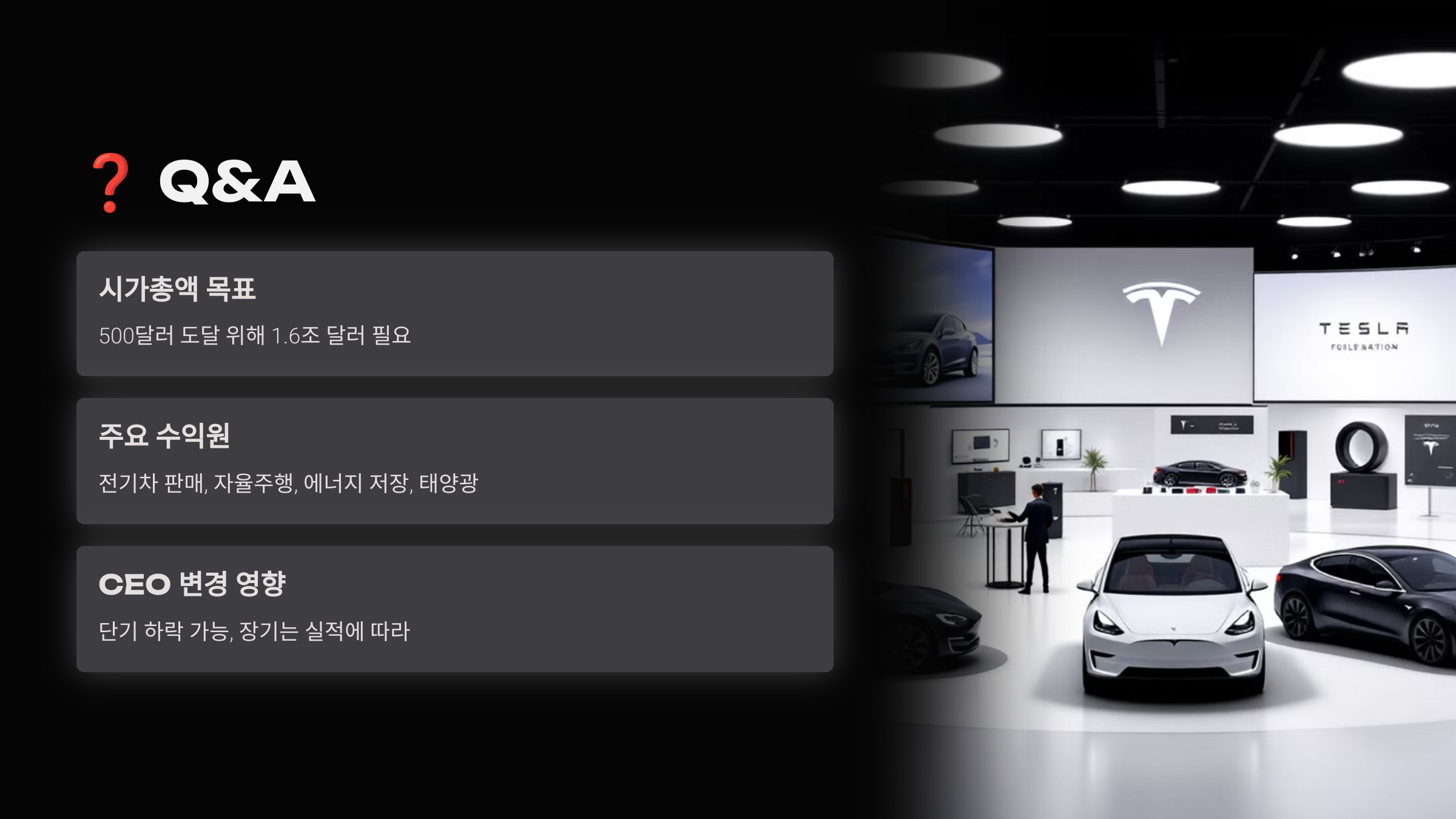 A2: 현재는 전기차 판매가 주 수익원이지만, 자율주행 기술, 에너지 저장 시스템, 태양광 사업 등으로 다각화를 시도하고 있습니다.