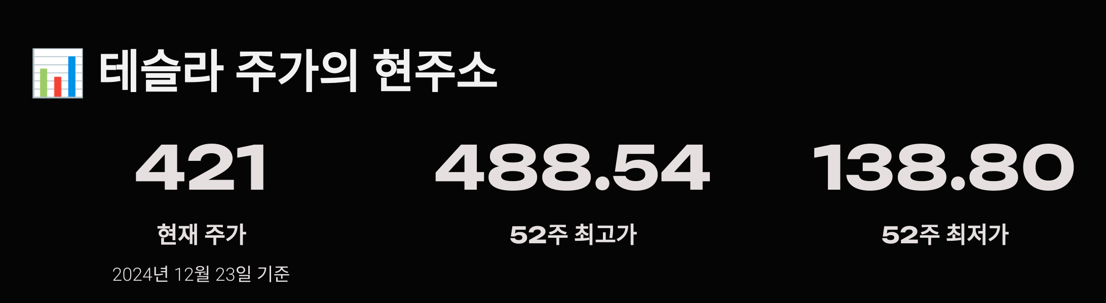 2024년 12월 23일 기준, 테슬라의 주가는 421달러입니다. 52주 최고가는 488.54달러, 최저가는 138.80달러로, 상당한 변동성을 보여주고 있습니다.