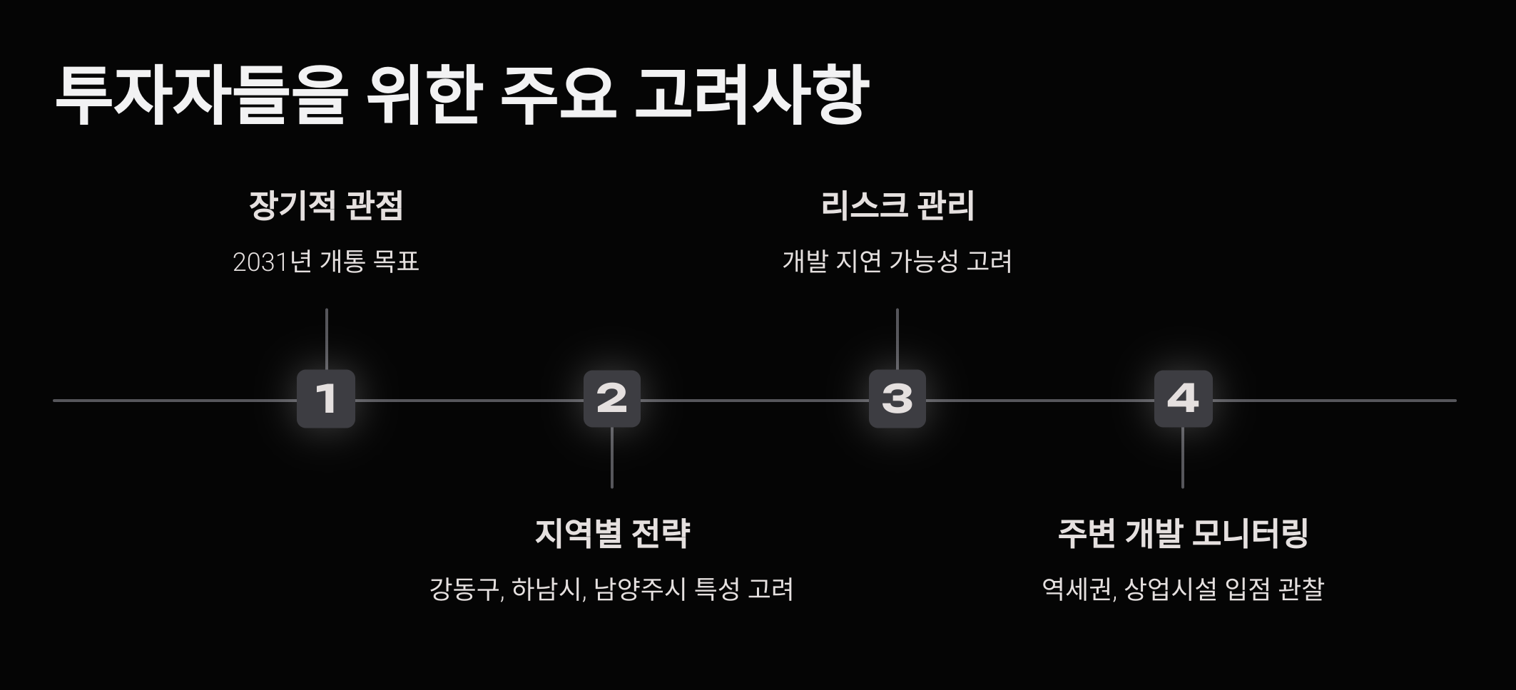 1. 📅 장기적 관점 필요: 2031년 개통 목표로 하는 만큼, 단기 수익보다는 장기 가치 상승에 초점