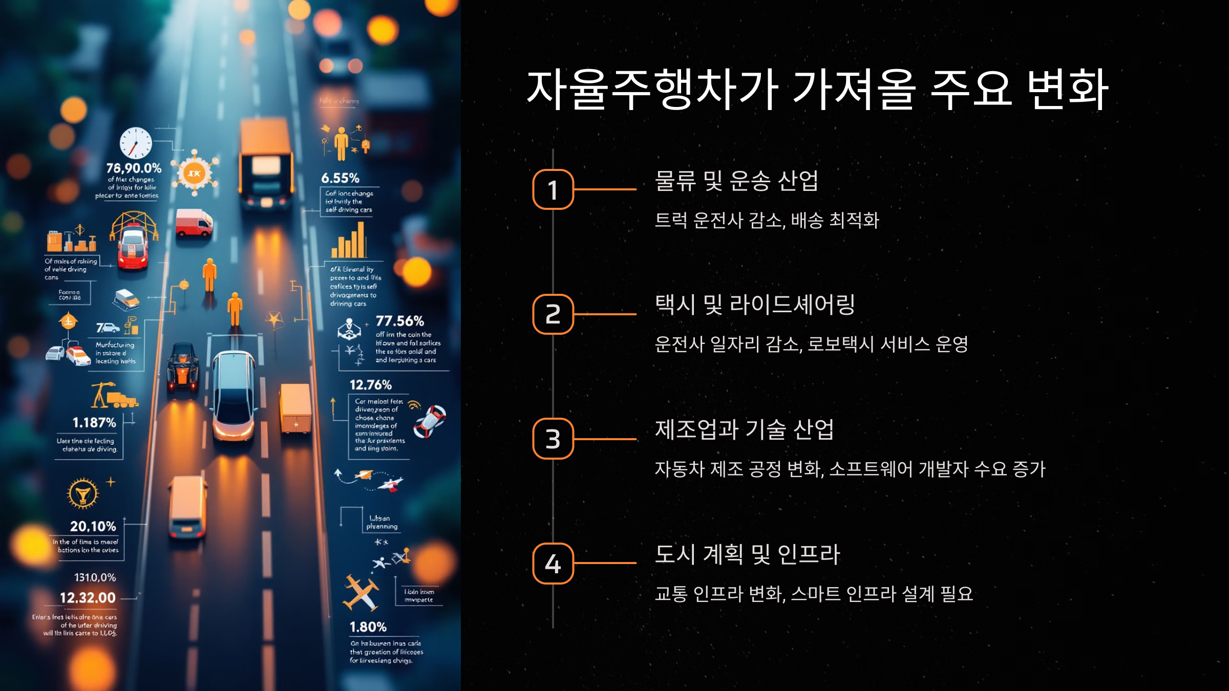 자율주행차 기술은 우리의 일상과 일자리 구조를 크게 바꿀 잠재력을 가지고 있습니다.