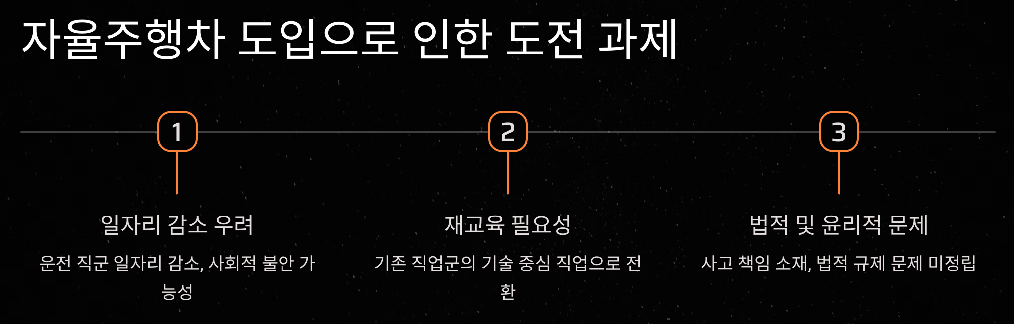 • 자율주행차 도입으로 인한 사고 책임 소재와 법적 규제 문제는 아직 명확히 정립되지 않았습니다.