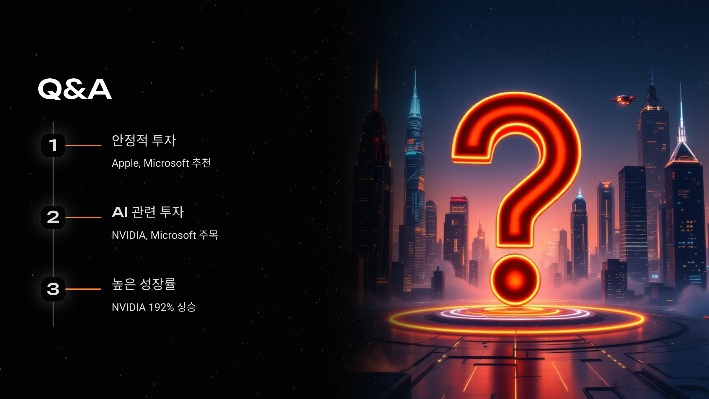 A2: NVIDIA와 Microsoft를 주목해 볼 만합니다. NVIDIA는 AI용 칩 생산에서 선두를 달리고 있으며, Microsoft는 AI 기술을 다양한 서비스에 접목시키고 있습니다.