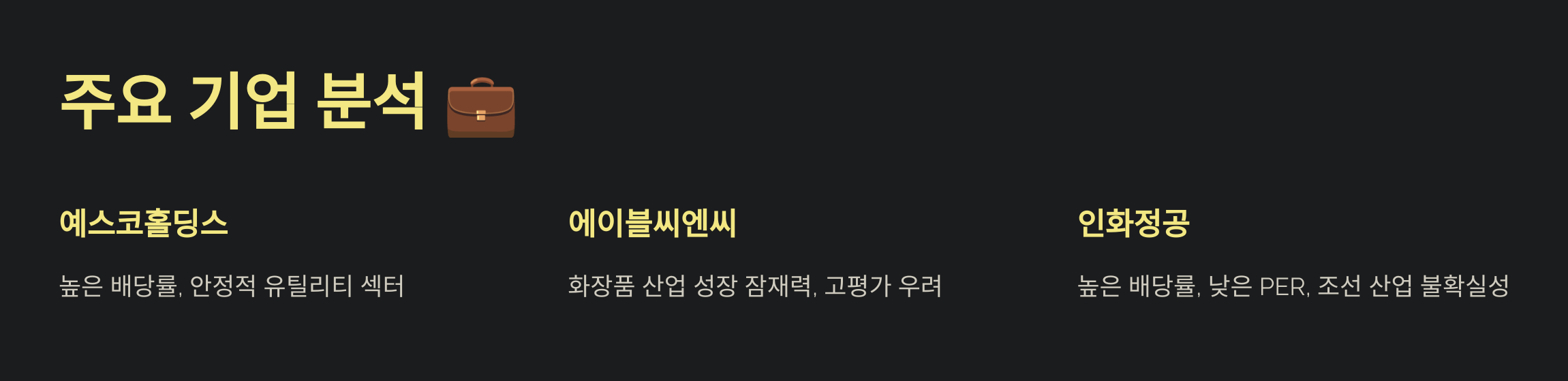• 장점: 높은 배당률, 안정적인 유틸리티 섹터