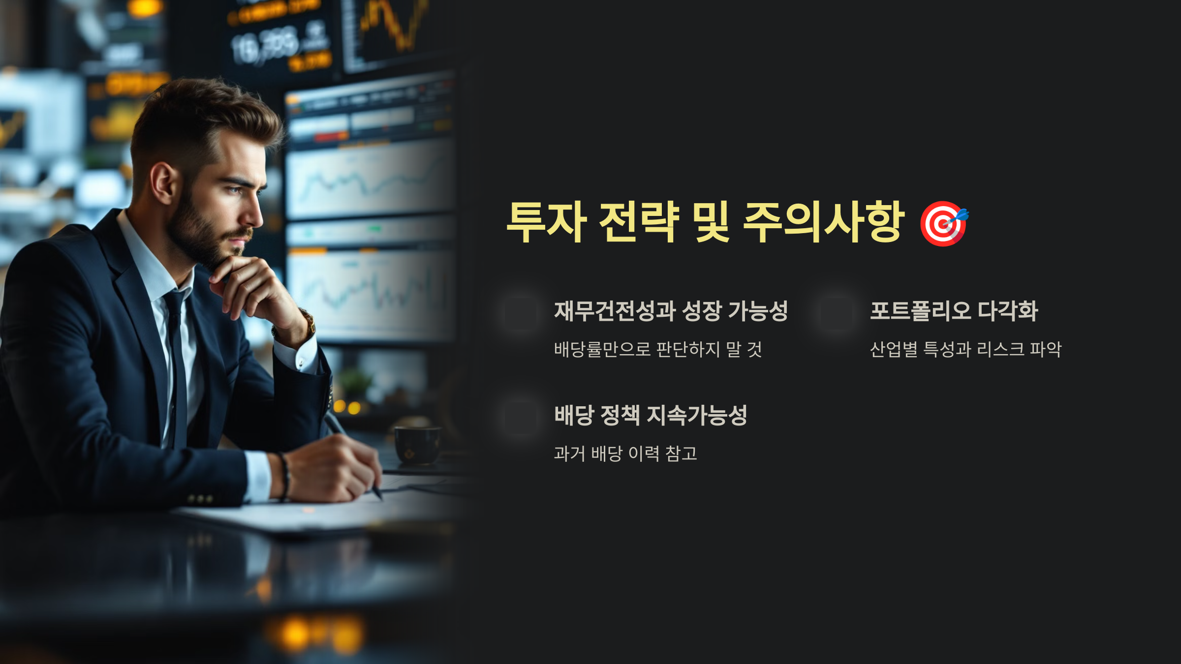 1. 배당률만으로 판단하지 말고, 기업의 재무건전성과 성장 가능성을 함께 고려하세요.