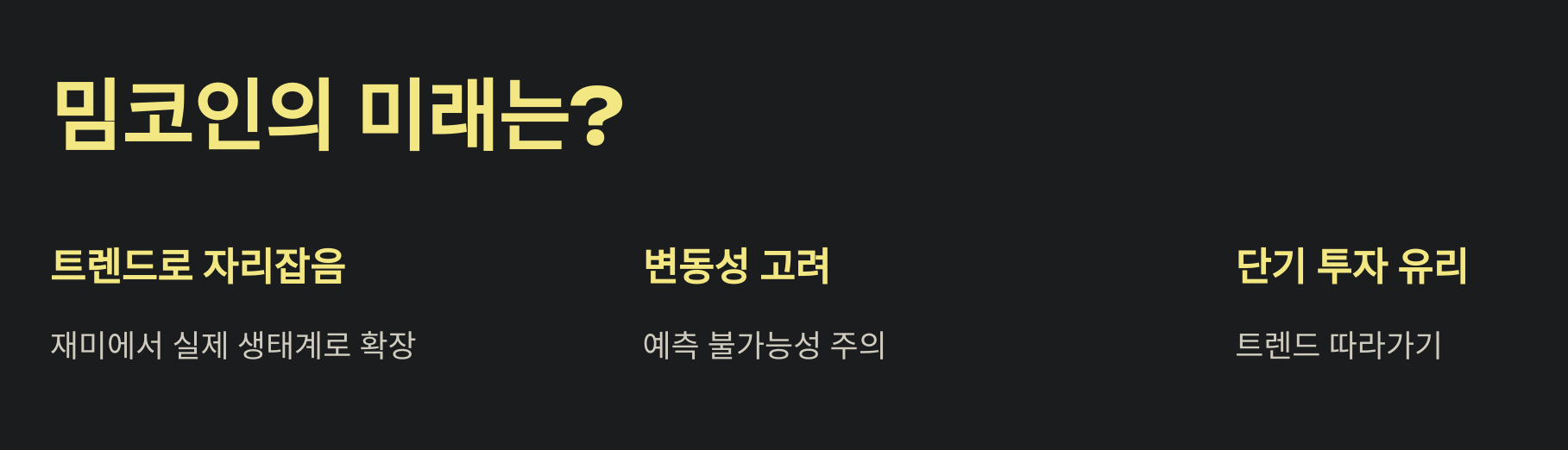 밈코인의 성공은 커뮤니티와 트렌드에 크게 의존하기 때문에, 장기적인 투자보다는 단기적 트렌드를 따라가는 것이 유리할 수 있습니다.