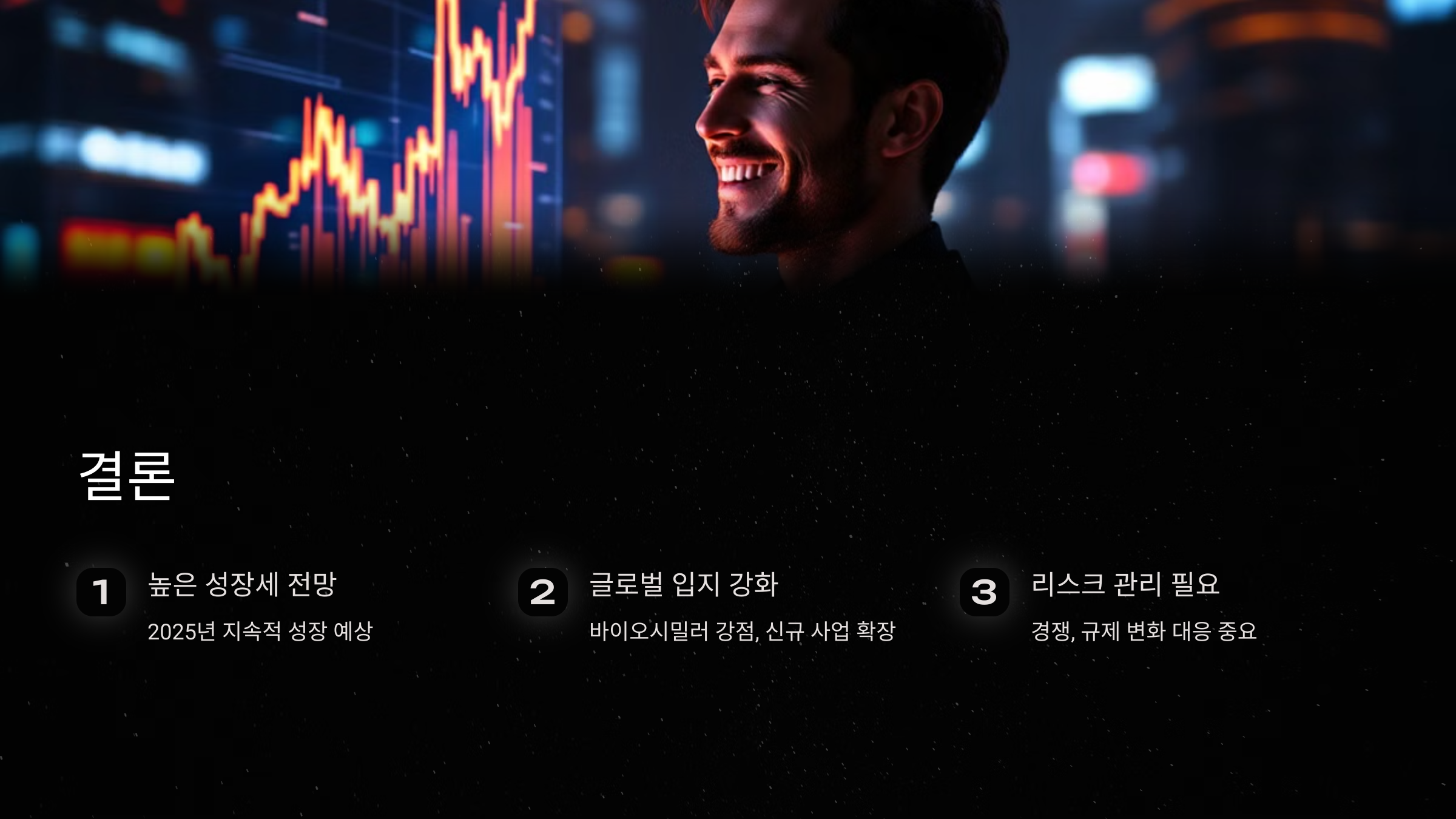 셀트리온은 2024년의 성공을 바탕으로 2025년에도 높은 성장세를 이어갈 것으로 전망됩니다. 바이오시밀러 시장에서의 강점신규 사업 확장을 통해 글로벌 바이오 기업으로서의 입지를 더욱 굳건히 할 것으로 예상됩니다. 다만, 경쟁 심화와 규제 환경 변화 등의 리스크 요인에 대한 지속적인 모니터링과 대응이 필요할 것입니다.