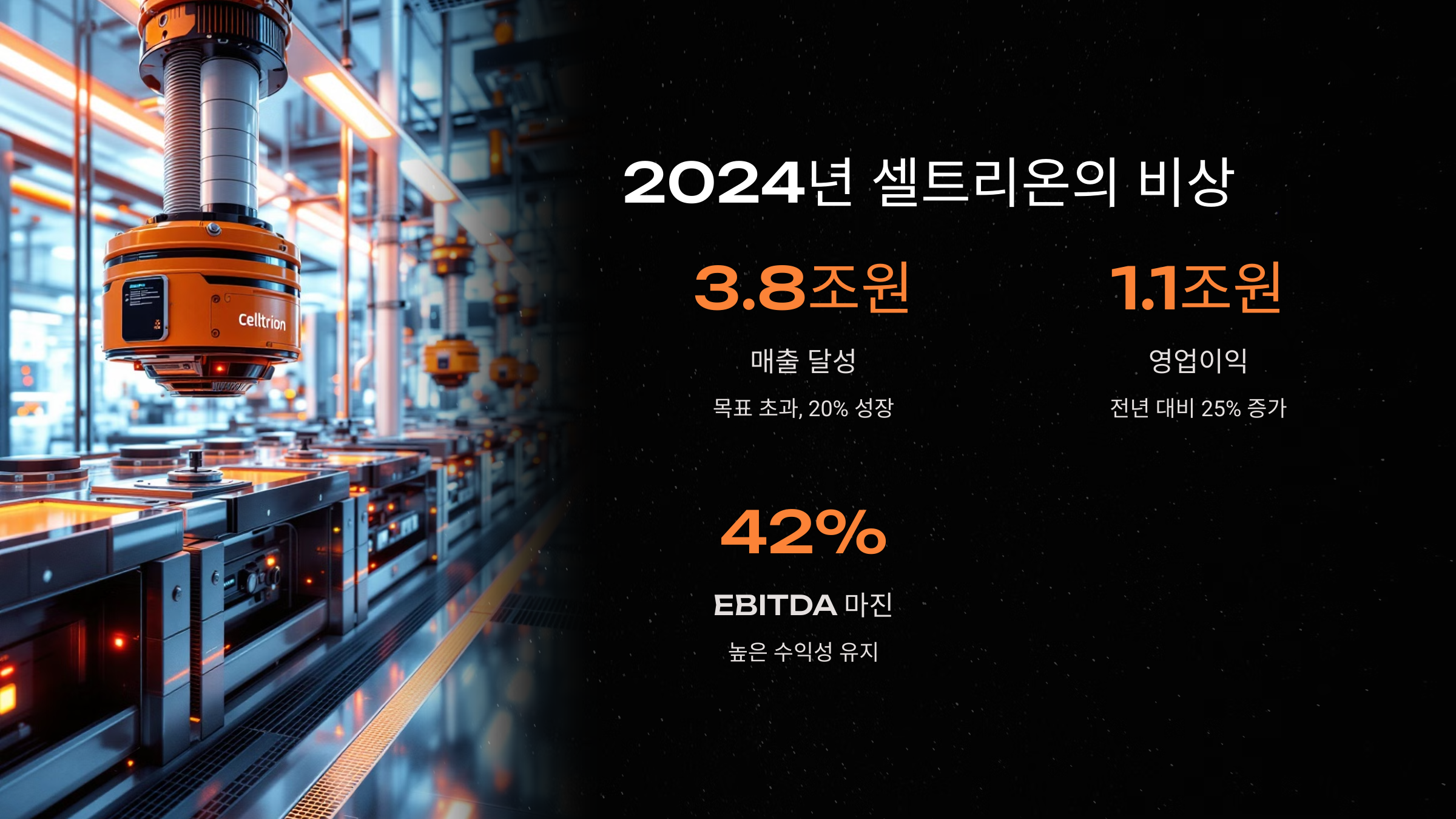 2024년 셀트리온은 당초 목표했던 3조 5천억 원을 넘어서는 3조 8천억 원의 매출을 달성했습니다. 이는 전년 대비 약 20% 성장한 수치로, 회사의 지속적인 성장세를 보여줍니다.
