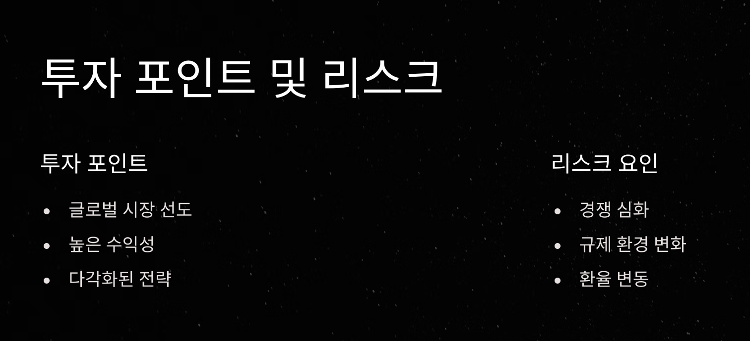 셀트리온은 2024년의 성공을 바탕으로 2025년에도 높은 성장세를 이어갈 것으로 전망됩니다. 바이오시밀러 시장에서의 강점신규 사업 확장을 통해 글로벌 바이오 기업으로서의 입지를 더욱 굳건히 할 것으로 예상됩니다. 다만, 경쟁 심화와 규제 환경 변화 등의 리스크 요인에 대한 지속적인 모니터링과 대응이 필요할 것입니다.