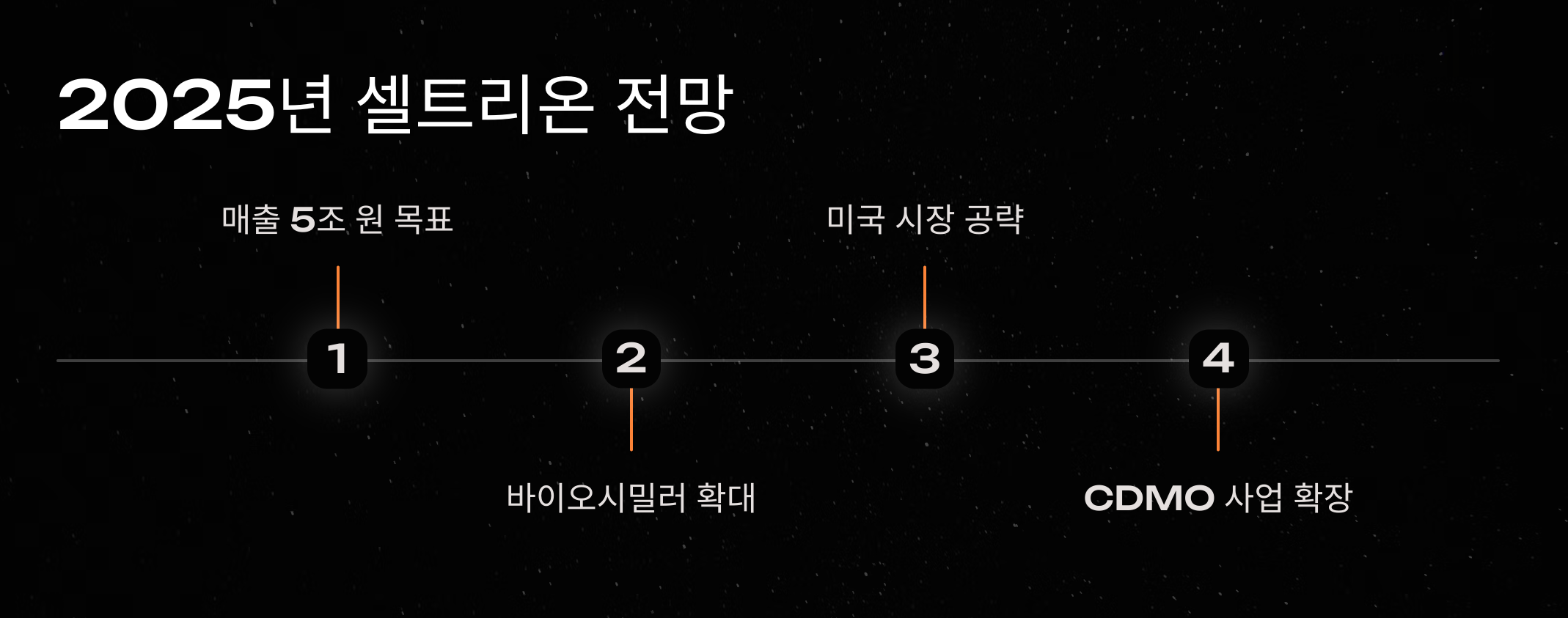 셀트리온은 2025년 매출 5조 원 달성을 목표로 하고 있습니다. 이는 2024년 실적 대비 약 30% 성장을 의미하는 도전적인 목표입니다.