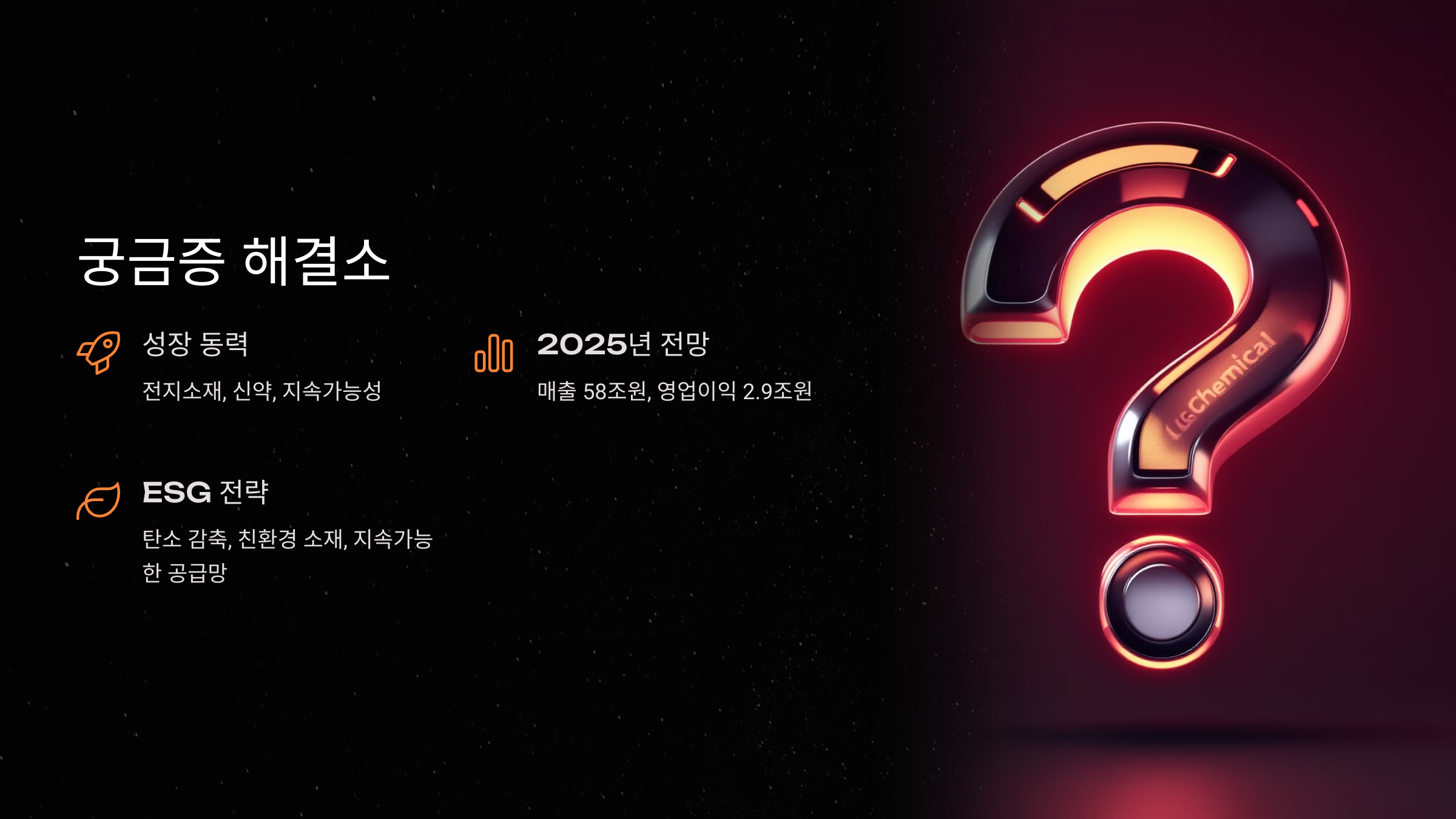 A: 전지소재, 신약, 지속가능성이 LG화학의 3대 비밀 무기입니다.