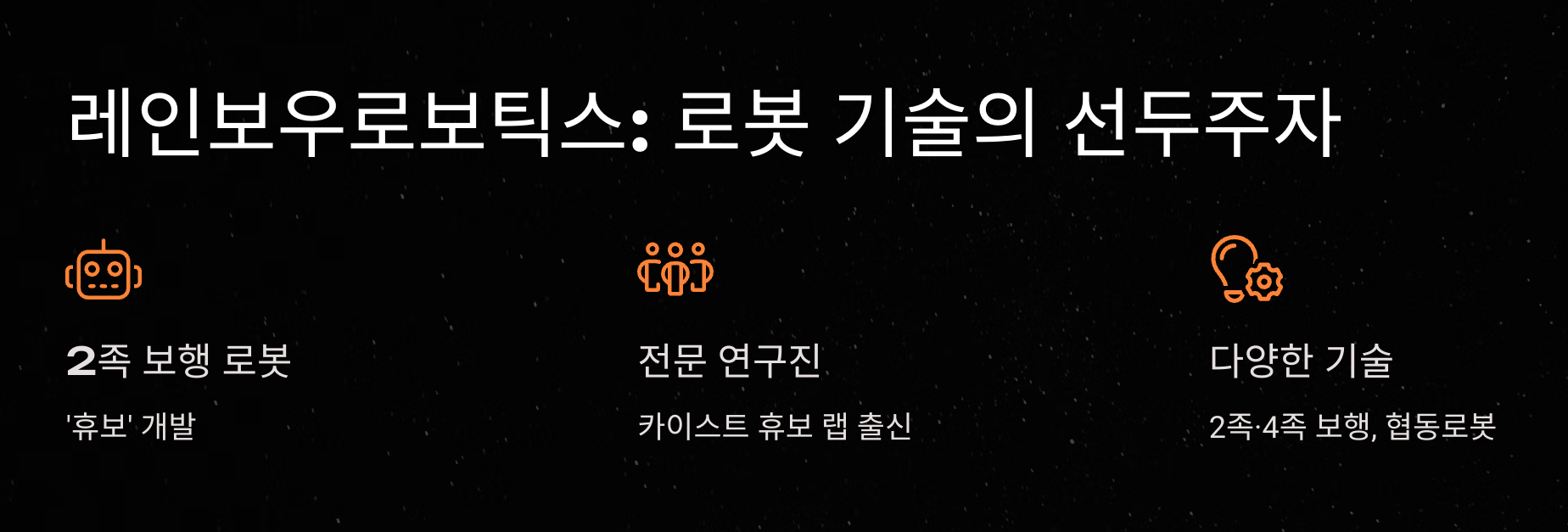 A: 2족·4족 보행 로봇, 협동로봇, 웨어러블 로봇 등 다양한 로봇 기술을 보유하고 있으며, 특히 휴보(HUBO) 개발 경험을 바탕으로 한 고급 로봇 기술이 강점입니다.