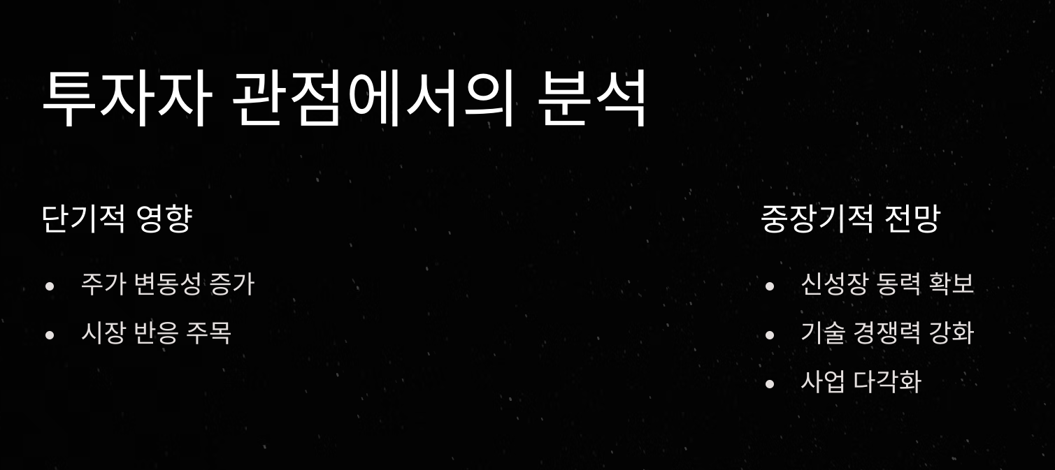 • 주가 변동성 증가: 대규모 투자로 인한 단기적인 비용 증가로 주가에 일시적 압박 가능성
