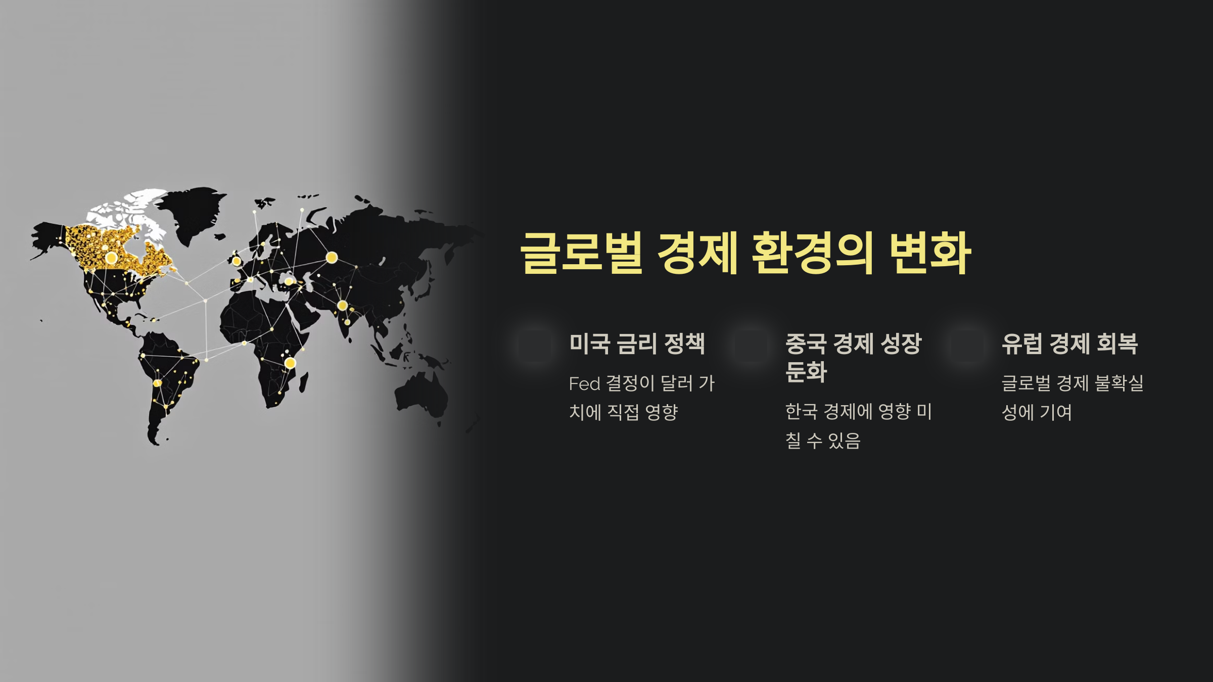2025년 원달러 환율의 주요 변수 중 하나는 글로벌 경제의 불확실성입니다. 미국의 금리 정책, 중국 경제의 성장 둔화, 유럽 경제의 회복 등은 모두 원달러 환율에 큰 영향을 미칠 수 있는 요소입니다. 특히, 미국 연방준비제도(Fed)가 금리를 지속적으로 인상하거나, 반대로 금리를 인하하는 결정은 달러 가치를 직접적으로 변화시킬 수 있습니다.
