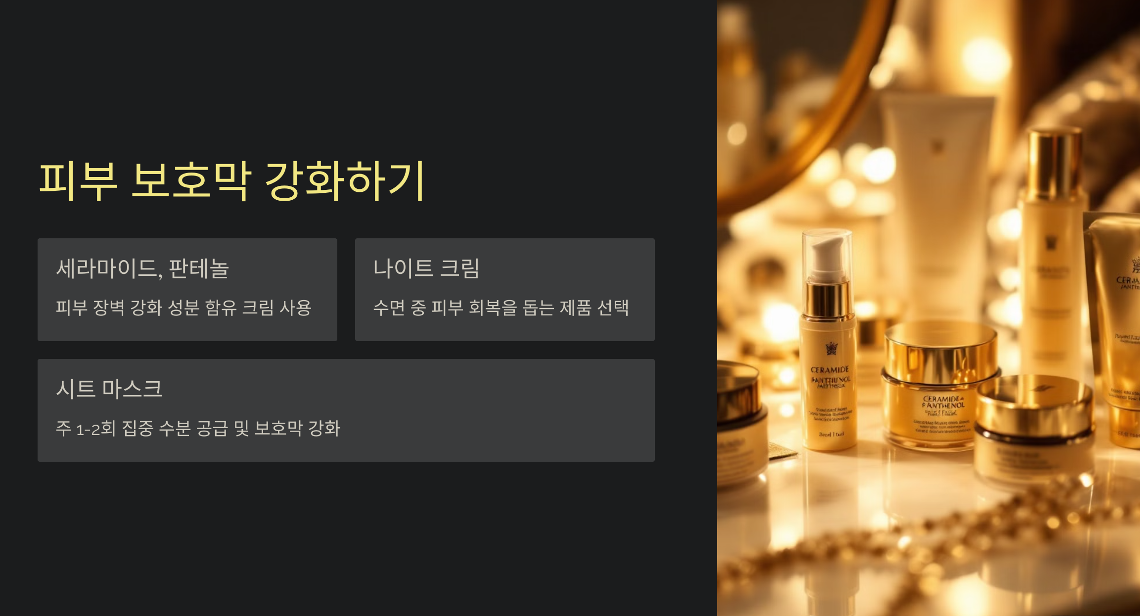 • 세라마이드판테놀은 피부 장벽을 강화해 주는 대표적인 성분이에요. 이 성분들이 포함된 크림을 사용하면 피부가 수분을 오래 유지할 수 있고 외부 자극으로부터 보호됩니다.