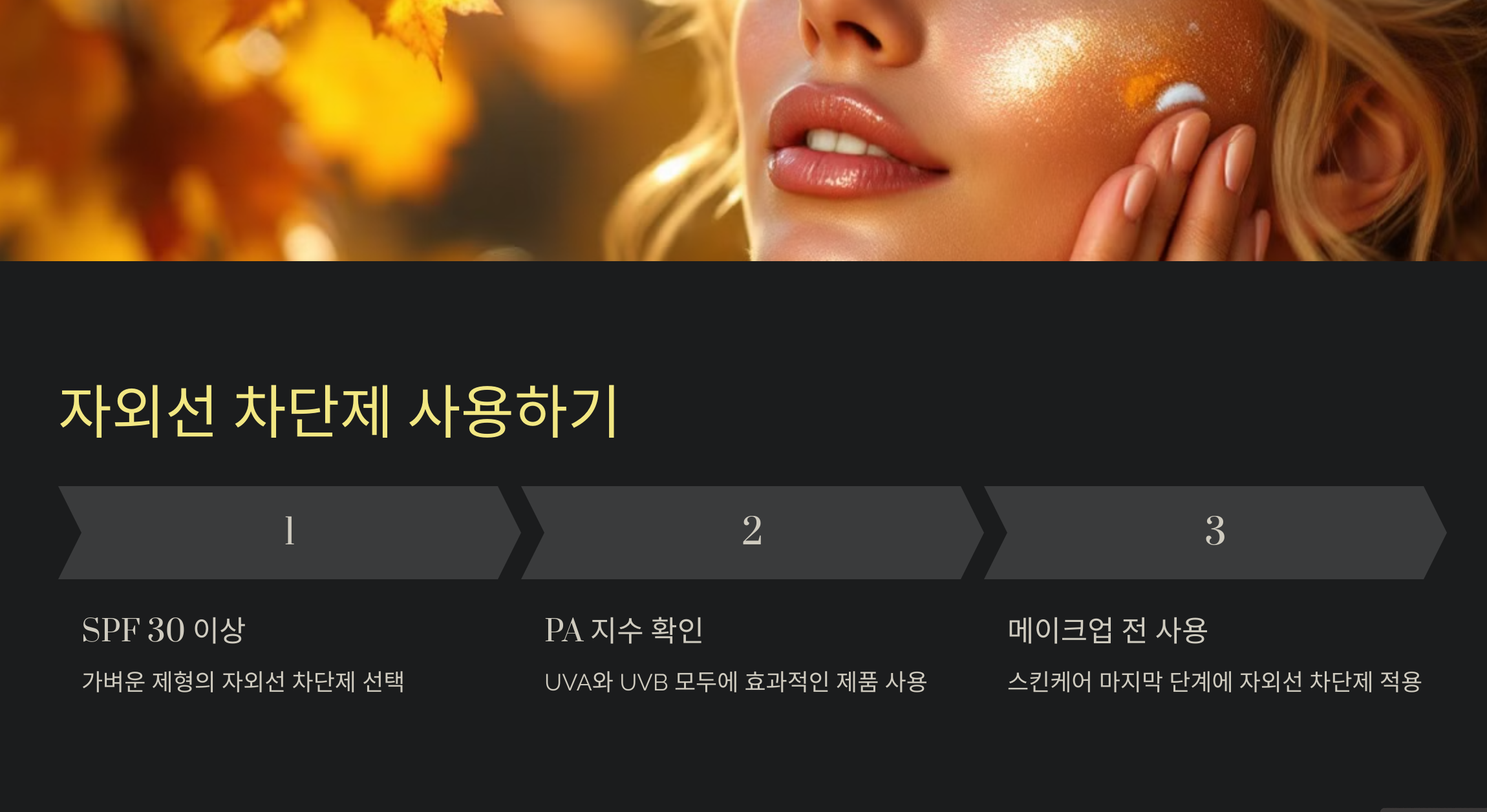• 가을철에는 SPF 30 정도의 자외선 차단제를 사용하는 것이 적당해요. 자외선 차단지수가 너무 높으면 피부에 부담이 될 수 있으니 가벼운 제형을 선택하세요.