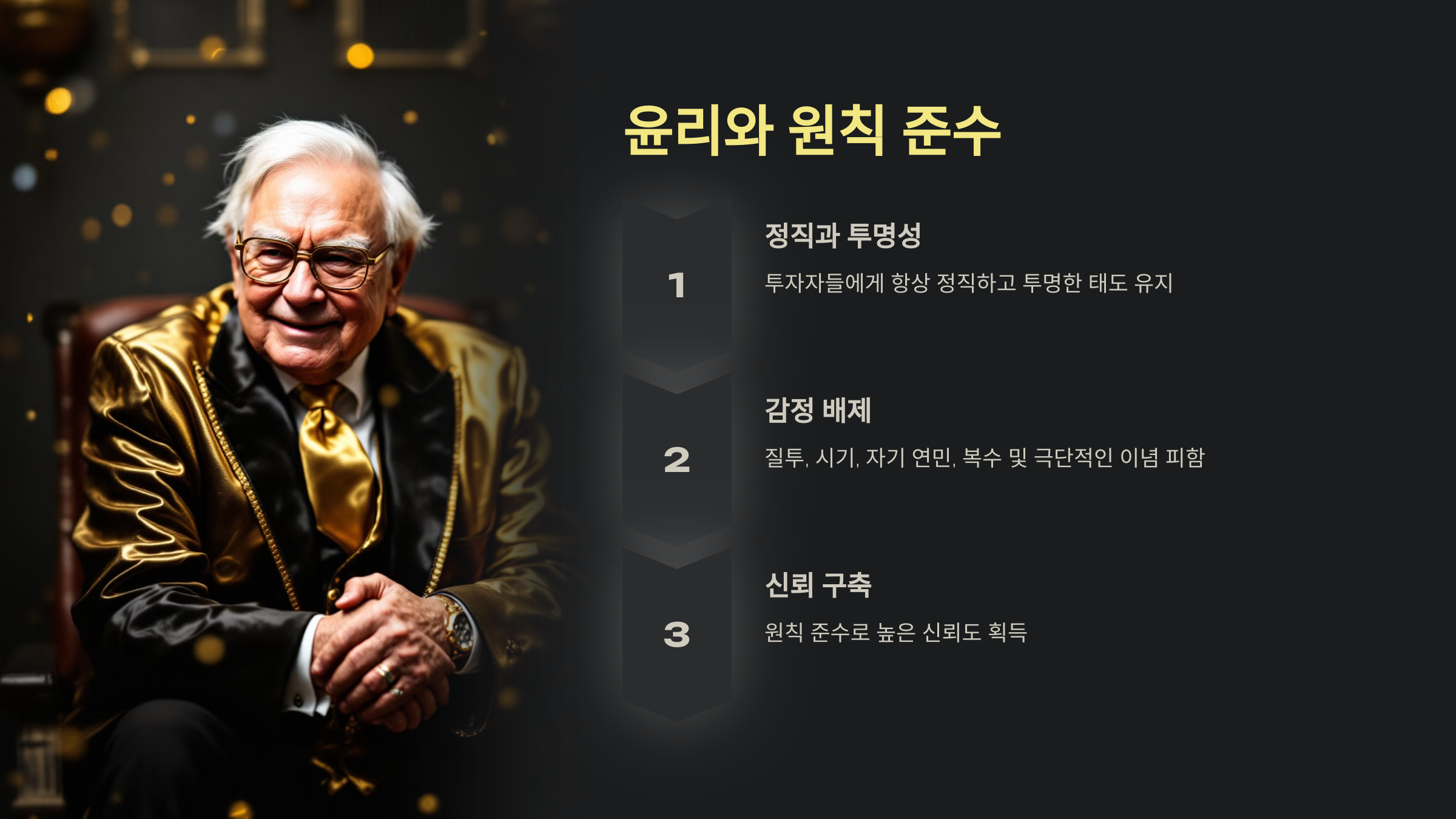 버핏의 세 번째 성공 비결은 그의 윤리의식과 원칙입니다.