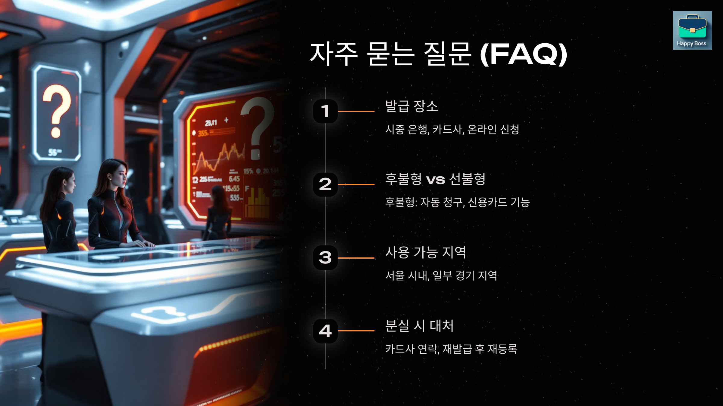 후불형 카드 출시로 충전 없이도 편리하게 이용할 수 있게 되었어요. 신용카드나 체크카드와 결합된 형태로, 매월 자동으로 요금이 청구됩니다.