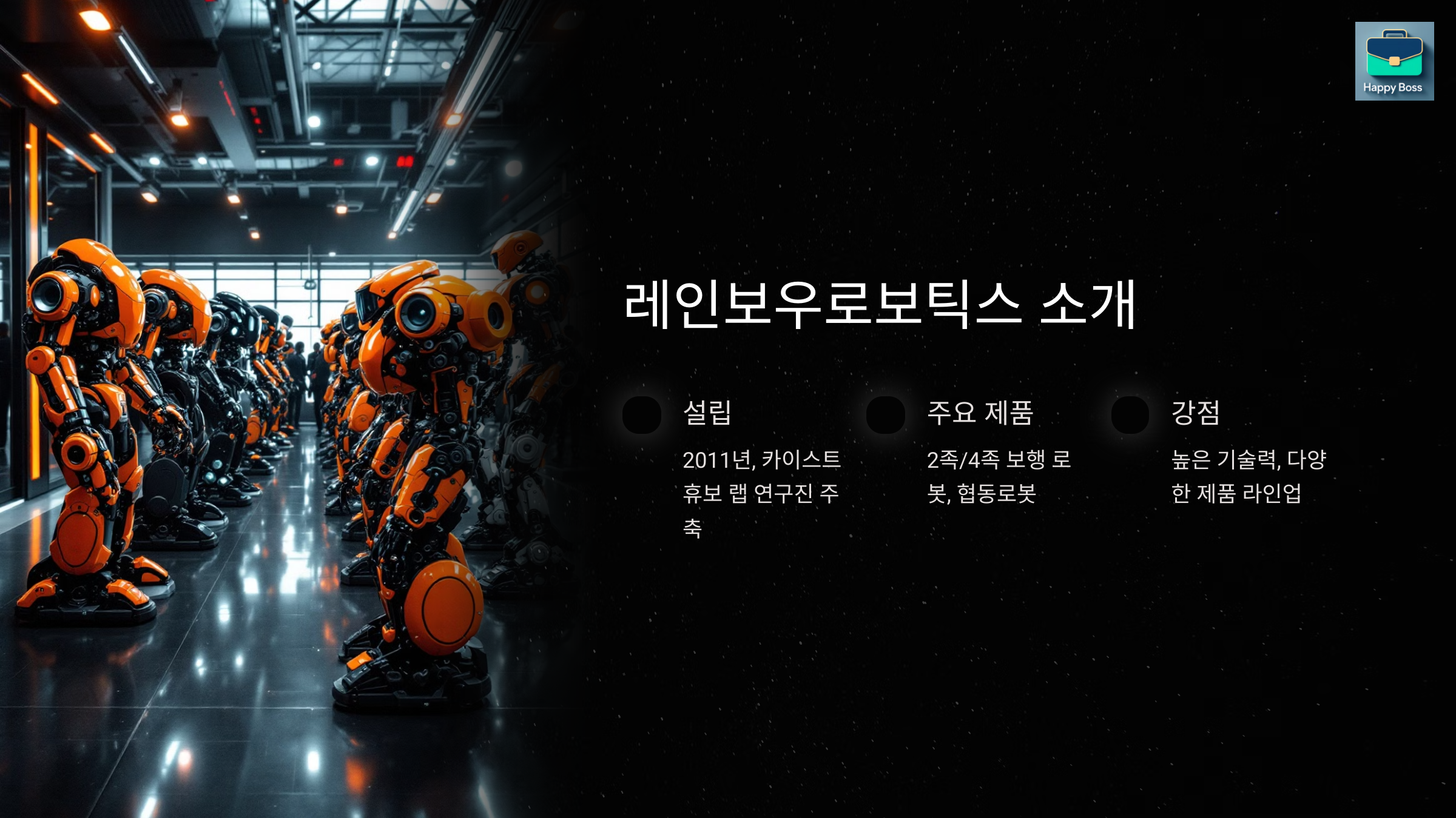 레인보우로보틱스는 2011년 설립된 국내 대표 로봇 전문기업입니다. 카이스트 휴보 랩 연구진들이 주축이 되어 설립한 이 회사는 국내 최초로 2족 보행 로봇 '휴보'를 개발한 것으로 유명합니다[1]. 주요 제품으로는 2족 보행 로봇, 4족 보행 로봇, 협동로봇 등이 있으며, 이러한 다양한 로봇 기술력을 바탕으로 빠르게 성장하고 있습니다.