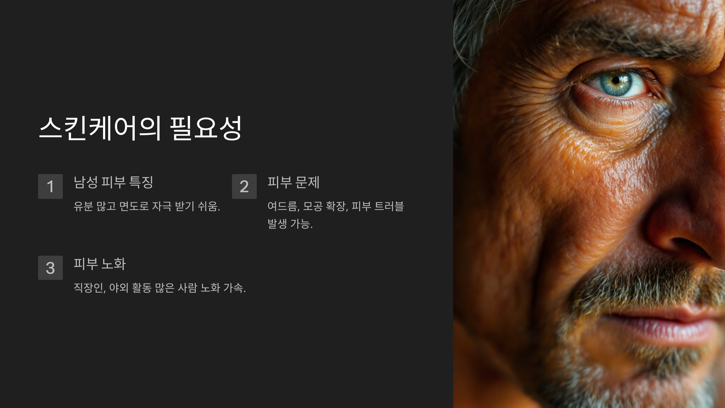 왜 스킨케어가 필요할까요? 남성의 피부는 여성과 조금 다릅니다. 주로 유분이 더 많고, 면도를 하면서 피부가 자극을 받기 쉬운 구조를 가지고 있습니다. 따라서 올바른 스킨케어를 하지 않으면 여드름, 모공 확장, 피부 트러블 같은 문제가 생기기 쉬운데요. 특히 직장인이나 야외 활동이 많은 분들은 피부 노화까지 가속될 가능성이 있습니다.