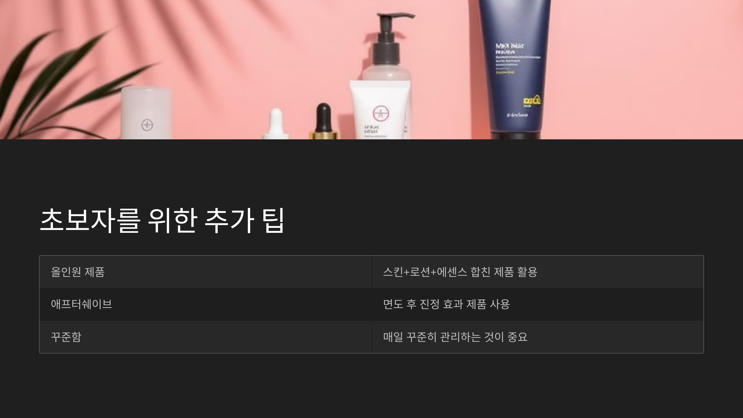 • 올인원 제품 활용: 여러 단계를 복잡하게 하기 어려운 분들은 스킨+로션+에센스를 합친 올인원 제품을 사용해 보세요. 사용하기 간편하고 시간을 절약할 수 있어요.