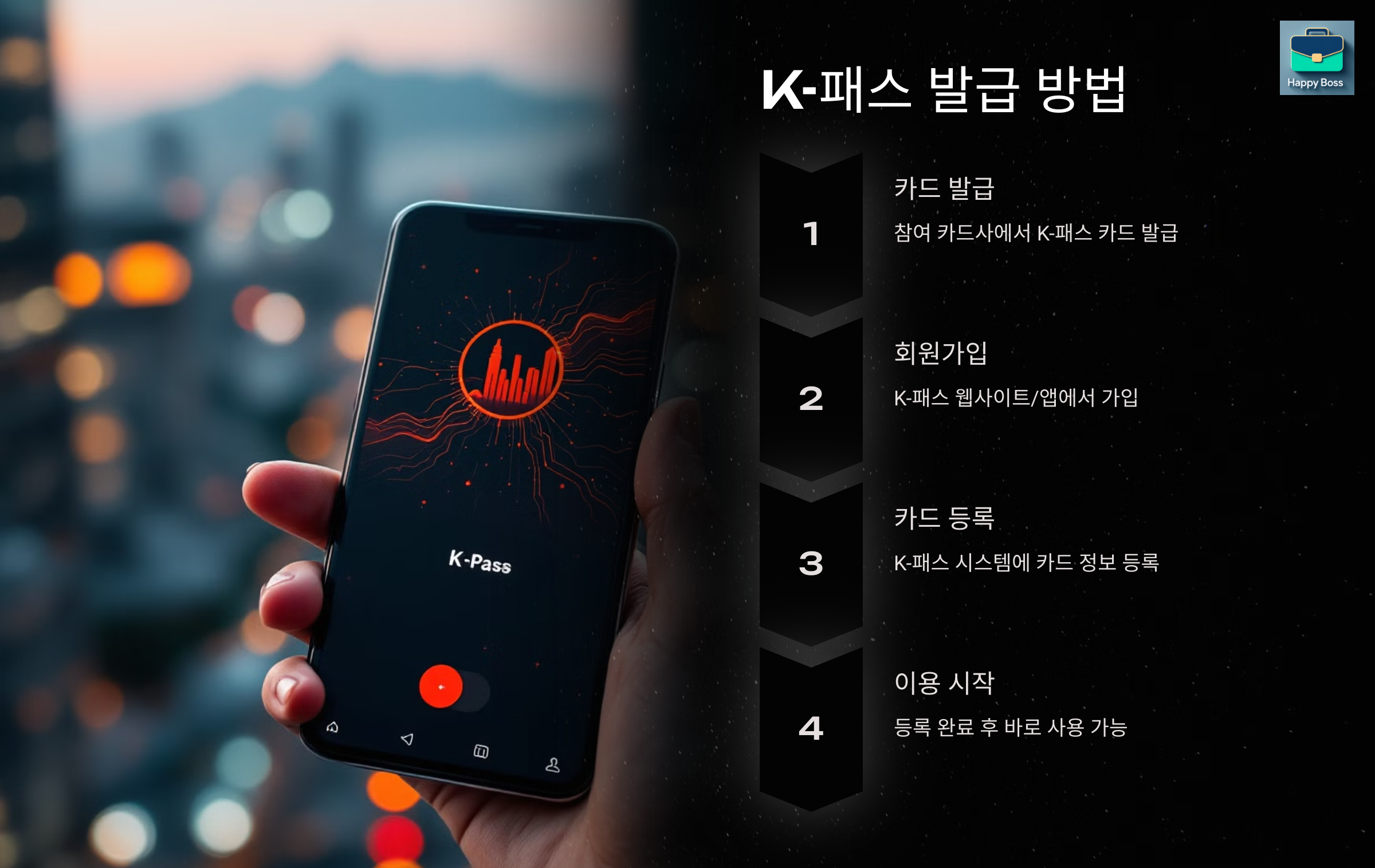 1. 카드 발급: 국민, 농협, BC, 삼성, 신한 등 참여 카드사에서 K-패스 신용카드 또는 체크카드 발급