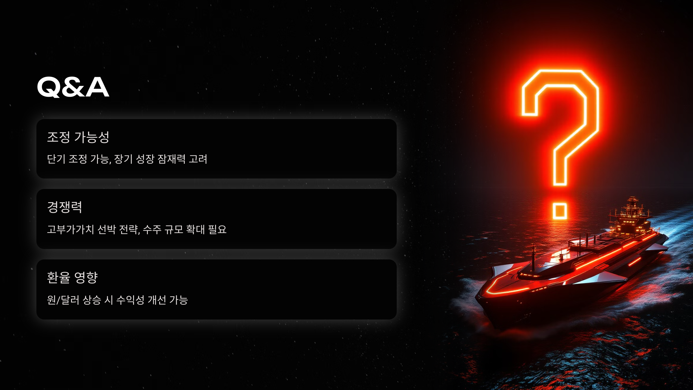 A3: 조선업은 대표적인 수출 산업이라 원/달러 환율 상승 시 수익성이 개선될 수 있습니다. 따라서 환율 동향도 주가 변동의 중요한 변수가 될 수 있습니다.