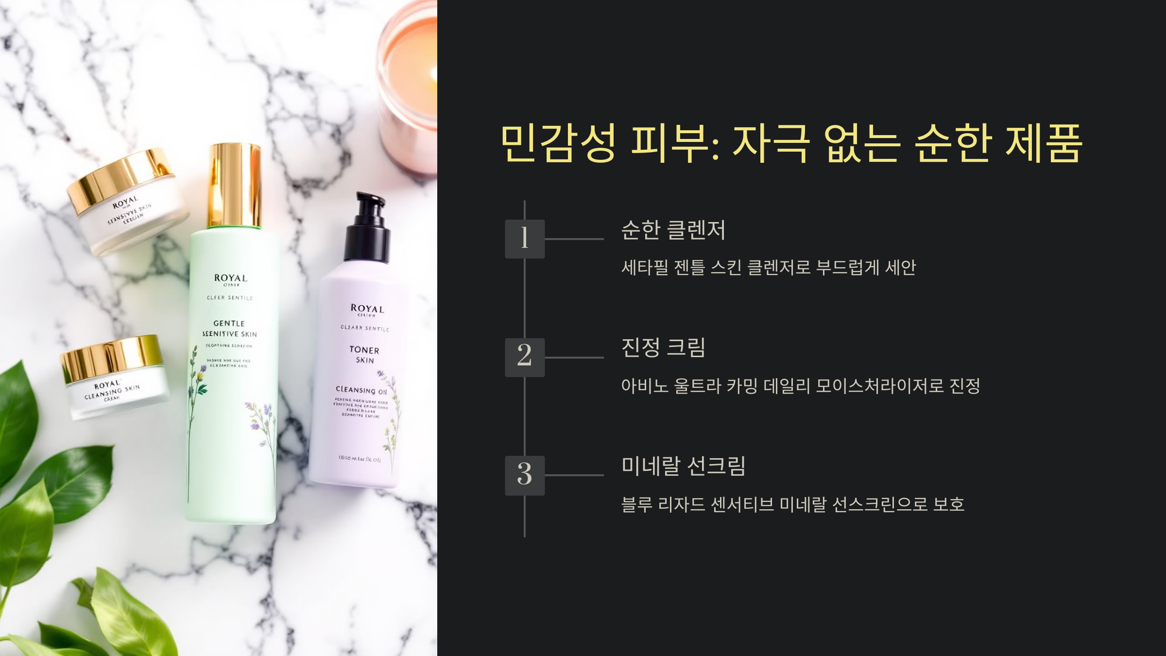 민감성 피부는 저자극, 무향료, 하이포알러제닉 제품을 선택해야 합니다. 피부를 진정시키고 자극을 최소화하는 것이 중요합니다.