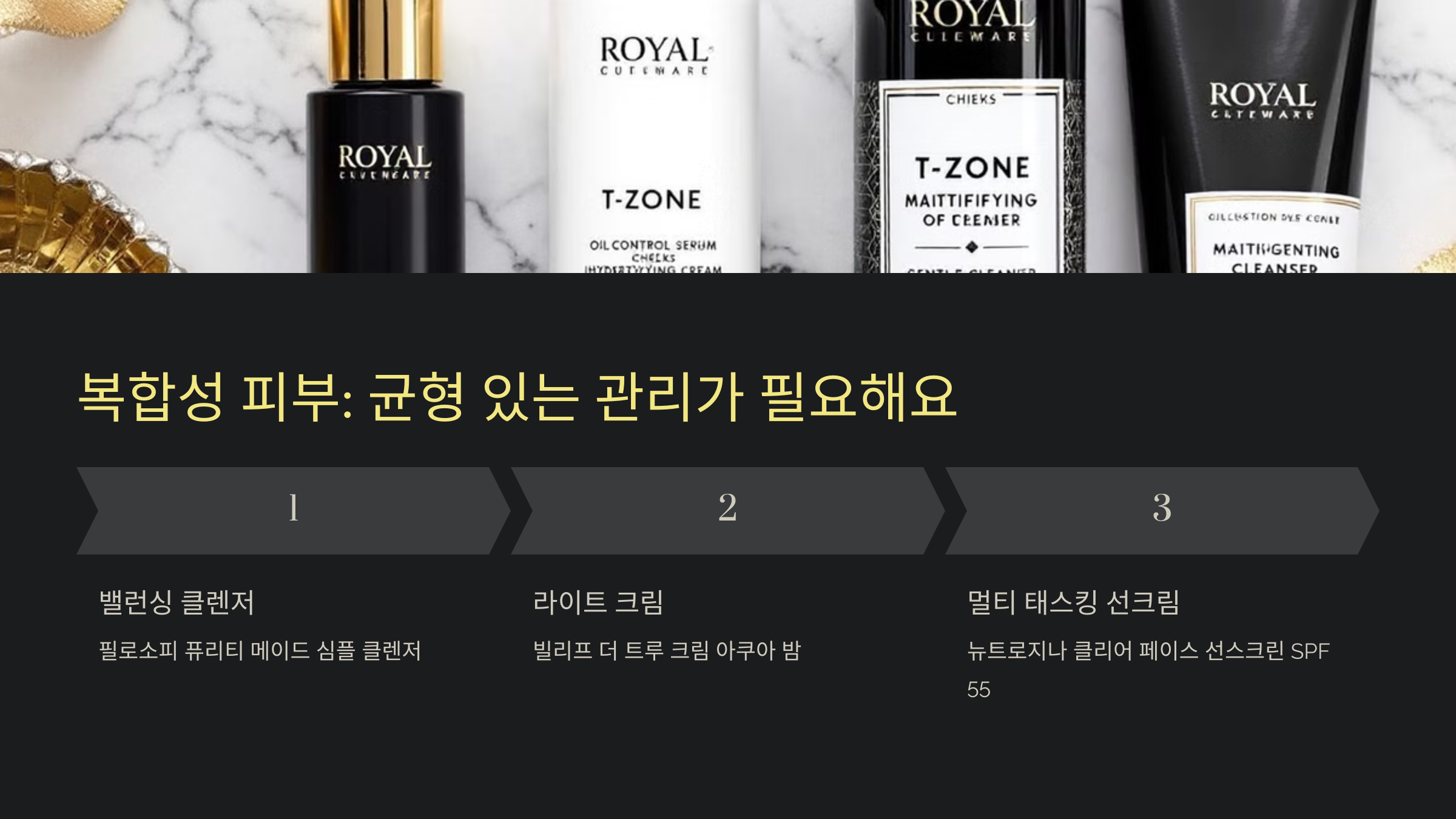 복합성 피부는 건조한 부위와 번들거리는 부위를 모두 케어할 수 있는 균형 잡힌 제품을 사용해야 합니다.
