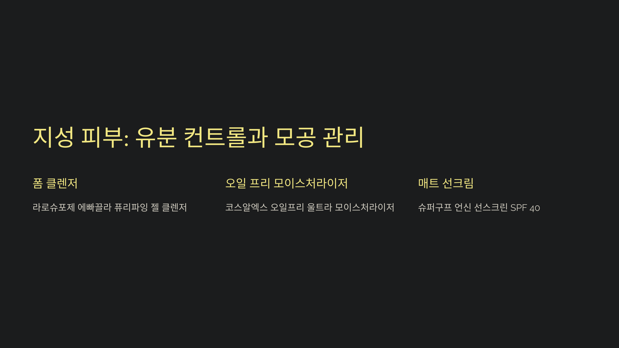 지성 피부는 과도한 유분 분비를 막고, 모공을 막지 않는 가벼운 제품을 선택해야 합니다.