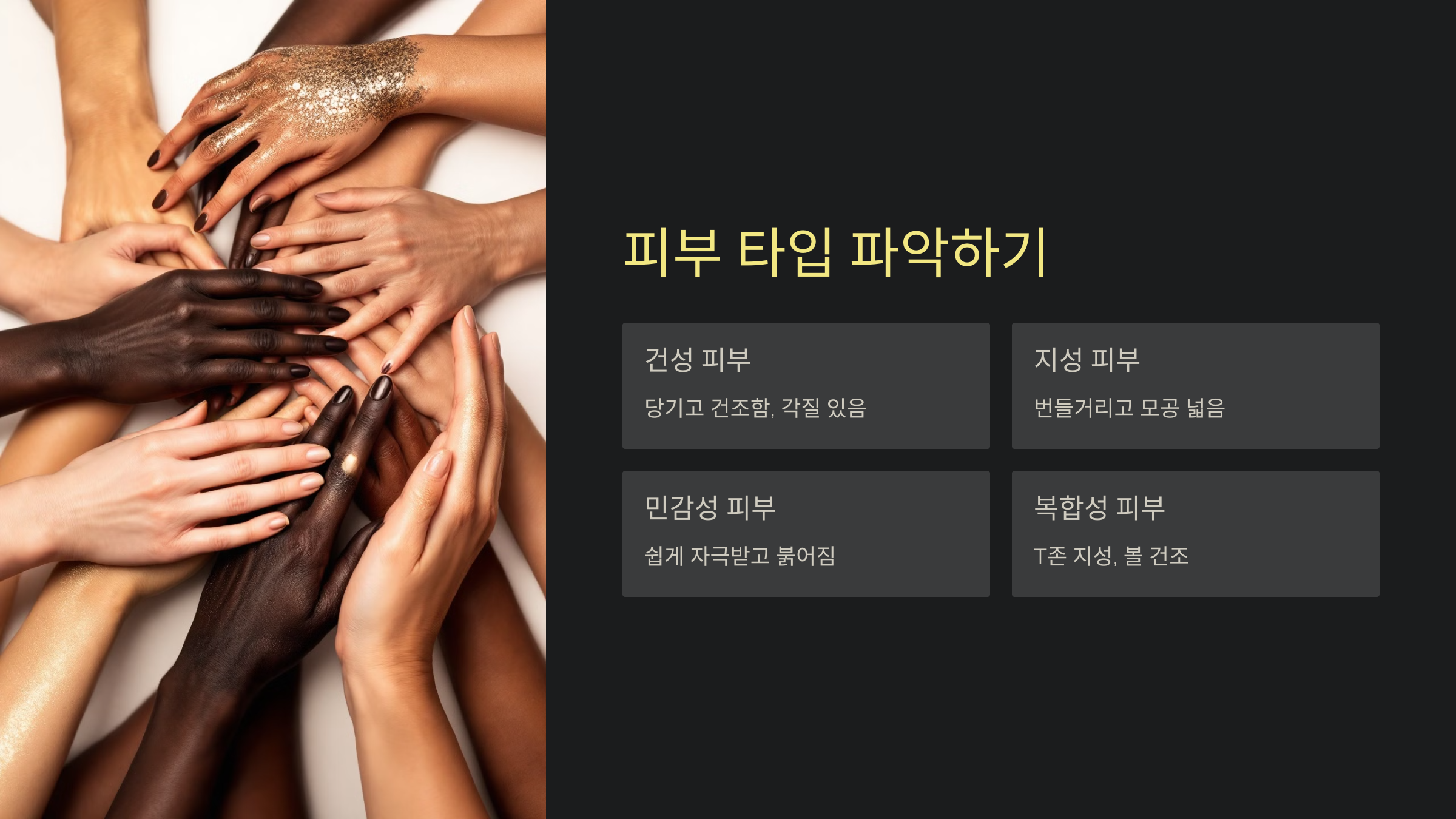 스킨케어 제품을 고르기 전에, 먼저 자신의 피부 타입을 파악하는 것이 중요합니다. 간단히 피부 타입을 확인해 볼까요?