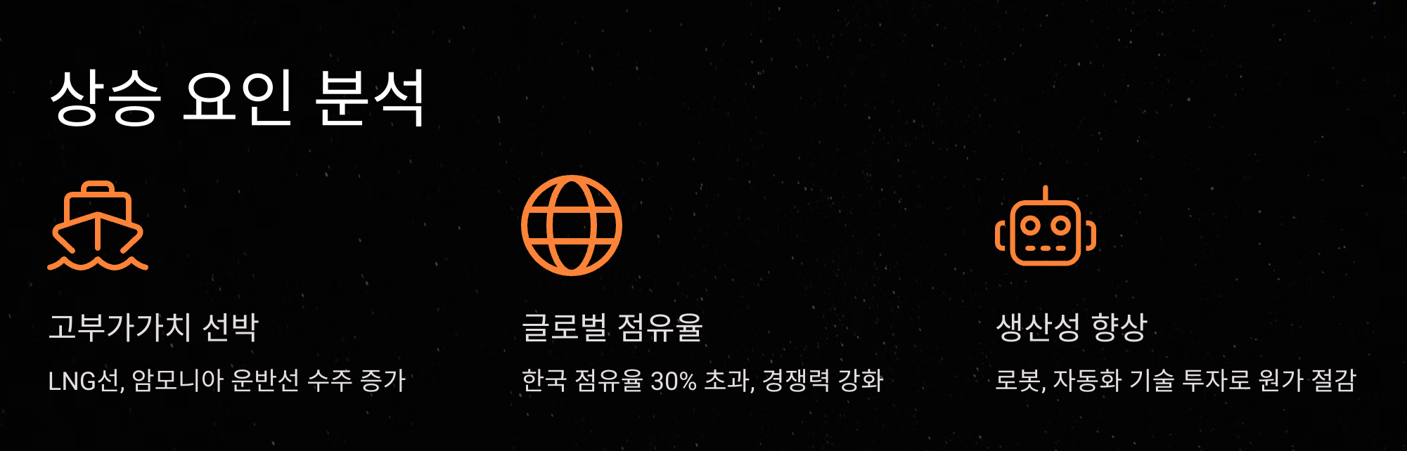 회사는 로봇과 자동화 기술 투자를 통해 생산성을 높이는 데 주력하고 있습니다. 또한, 후판 가격 하락 등 원가 절감 요인도 실적 개선에 긍정적인 영향을 미치고 있습니다.
