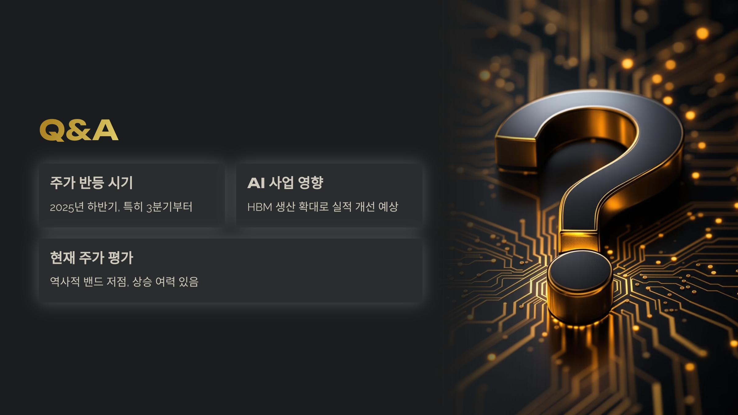 A2: AI 관련 수요 확대, 특히 HBM(고대역폭메모리) 생산 능력 확대가 2025년 하반기부터 실적 개선에 긍정적인 영향을 미칠 것으로 예상됩니다.