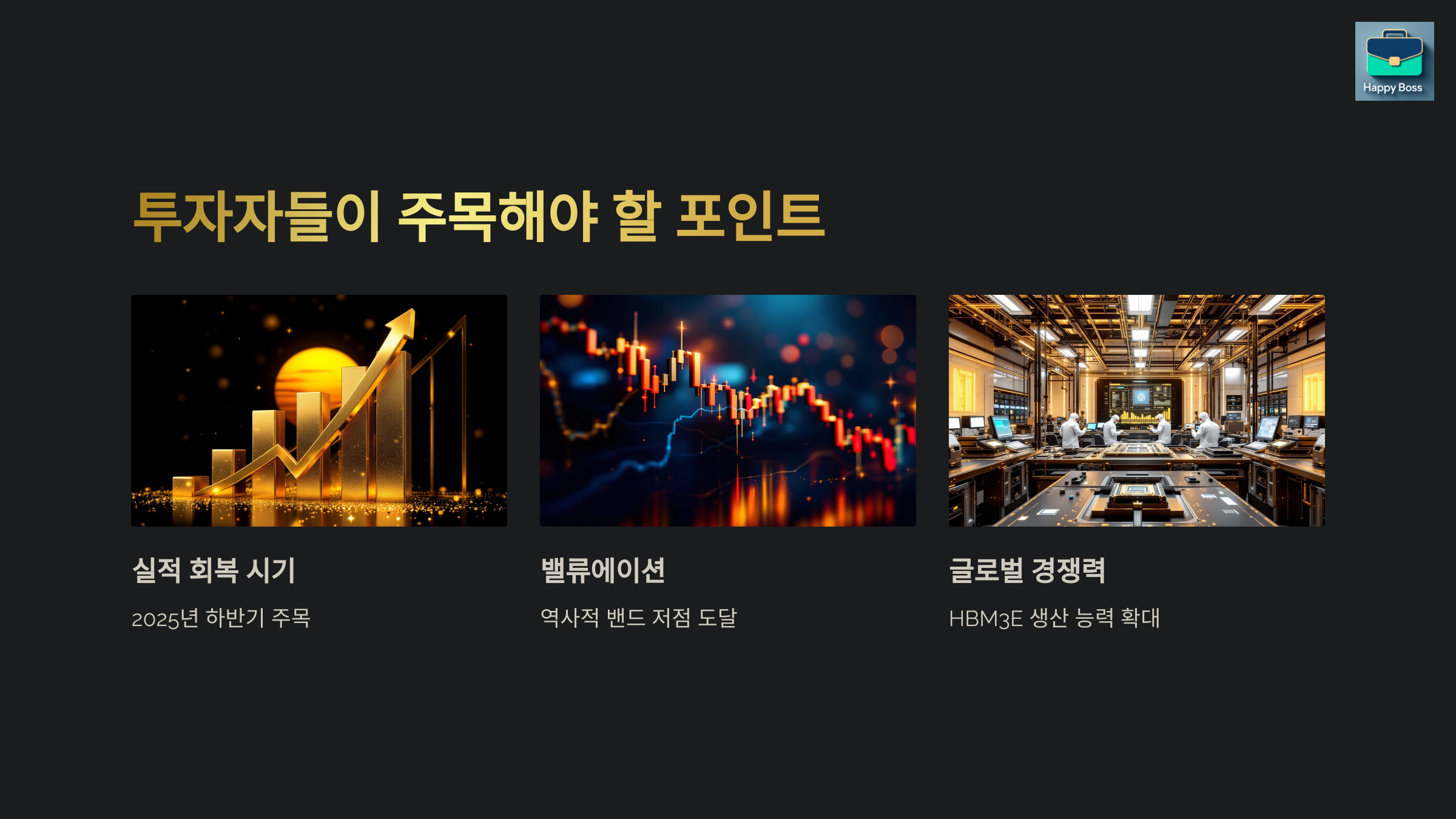 🌐 글로벌 경쟁력: HBM3E 생산 능력 확대와 AI 시장에서의 입지 강화가 중요한 변수가 될 것입니다.