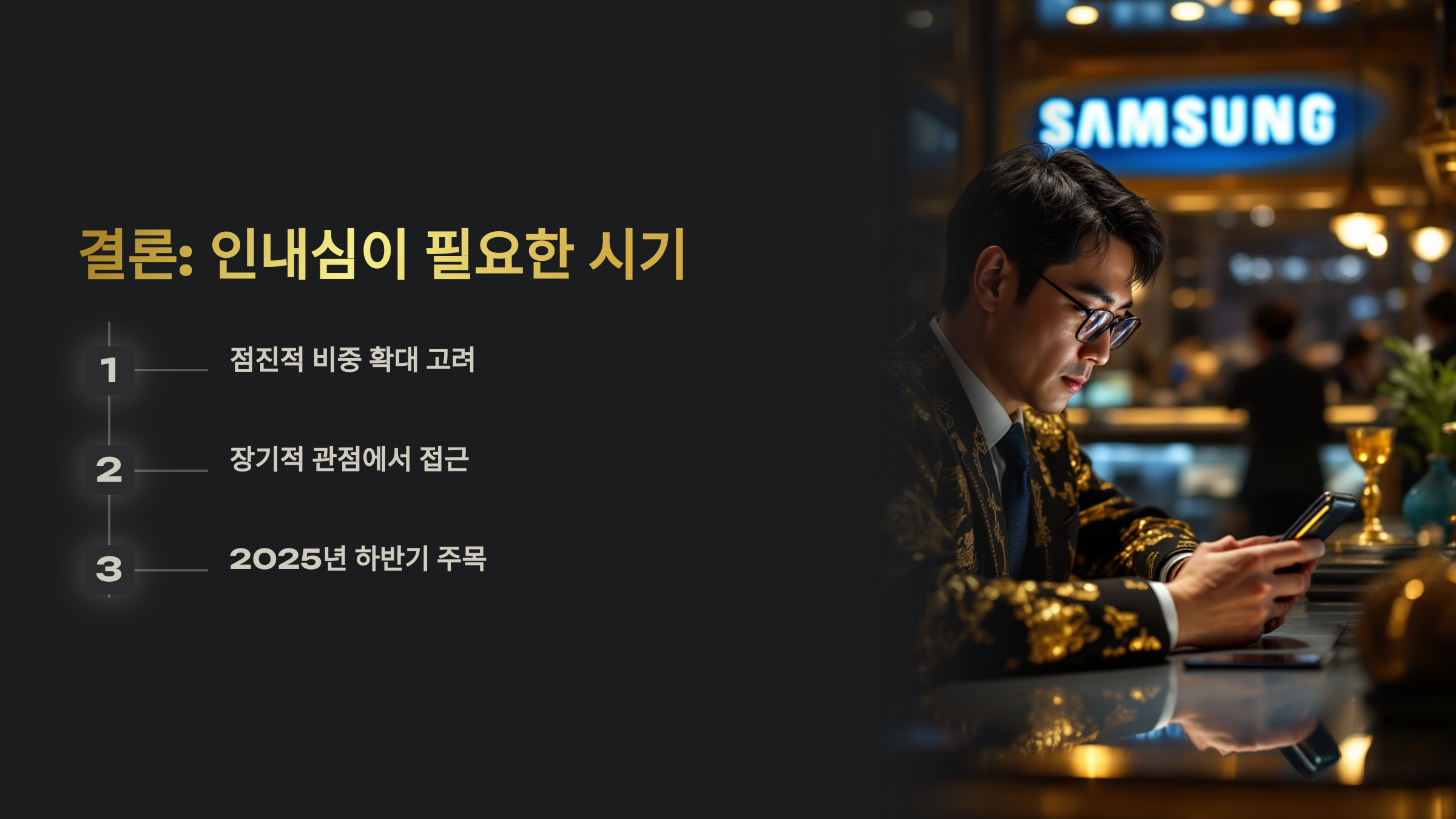 삼성전자가 과거의 영광을 되찾을 수 있을지, 그 열쇠는 2025년 하반기에 있을 것으로 보입니다. 투자자 여러분, 긴 호흡으로 지켜봐 주시기 바랍니다!