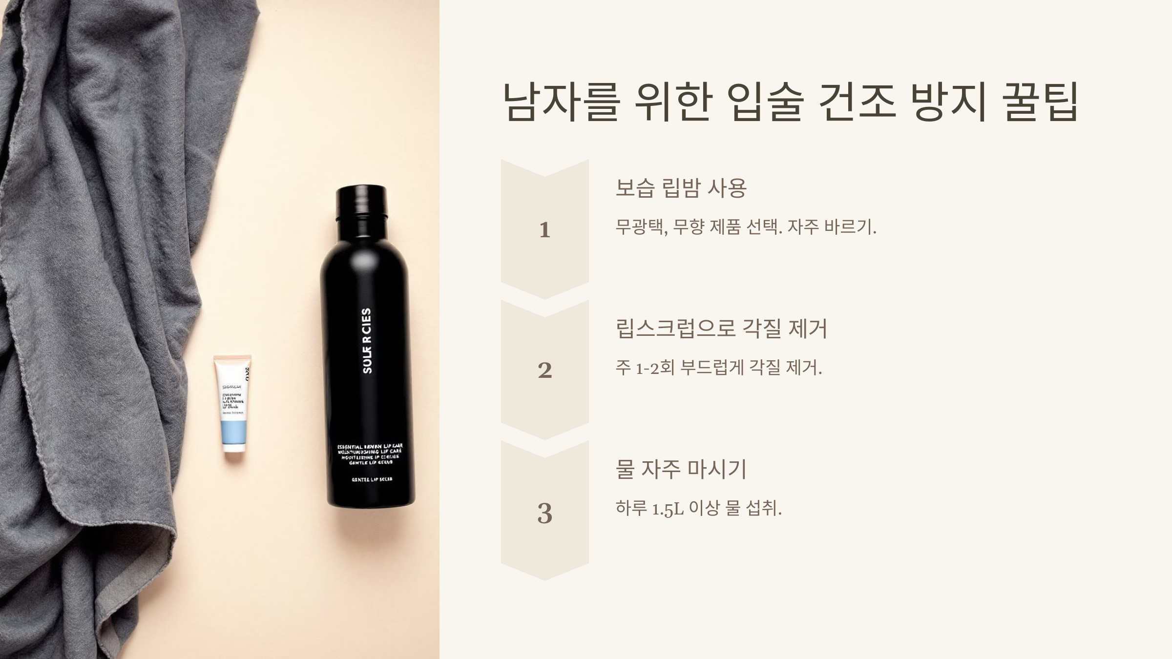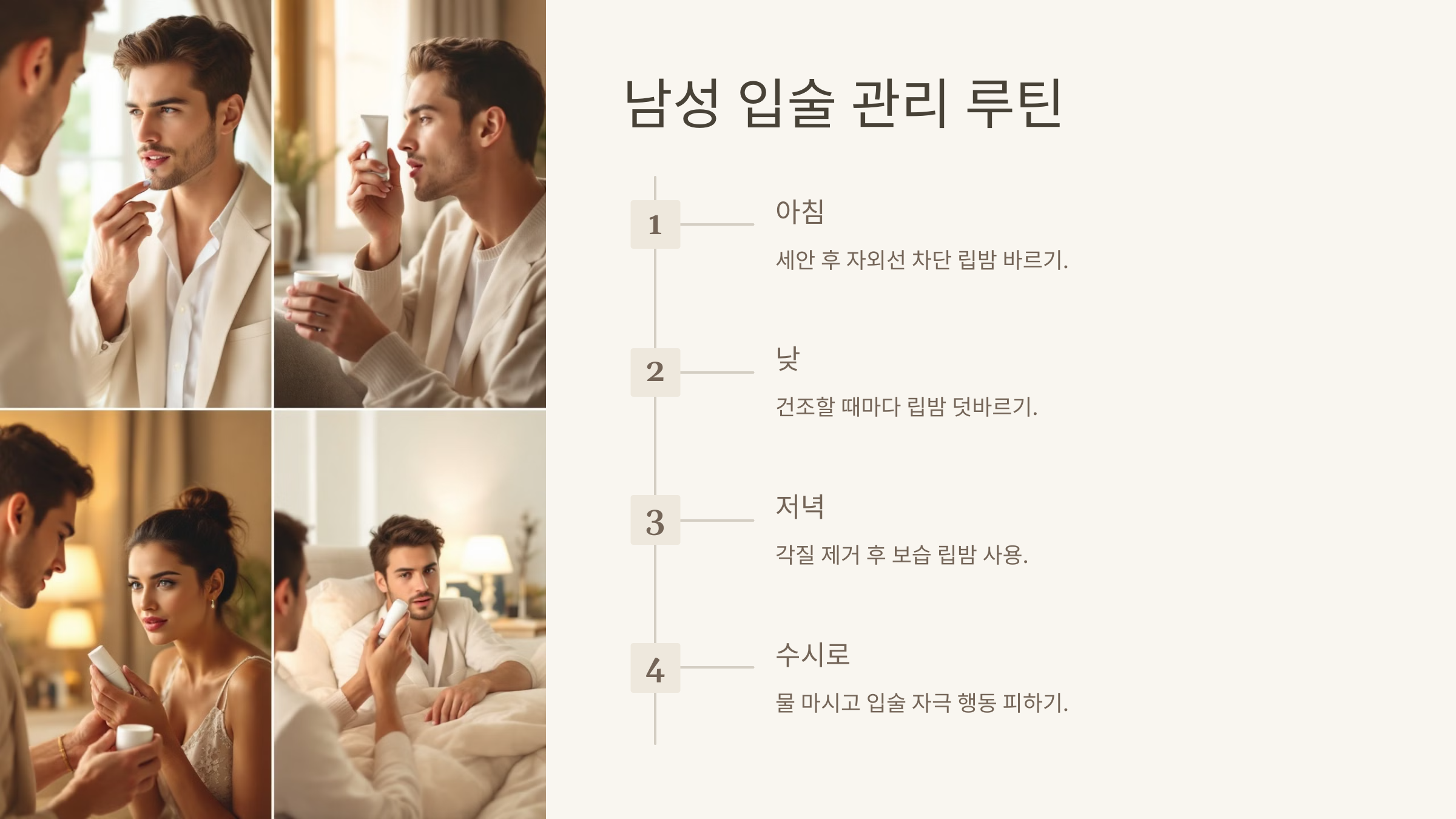 남성들은 간단하고 실용적인 방법을 선호하는 경우가 많습니다. 그래서 누구나 쉽게 실천할 수 있는 입술 관리 꿀팁을 모아봤어요! 😊