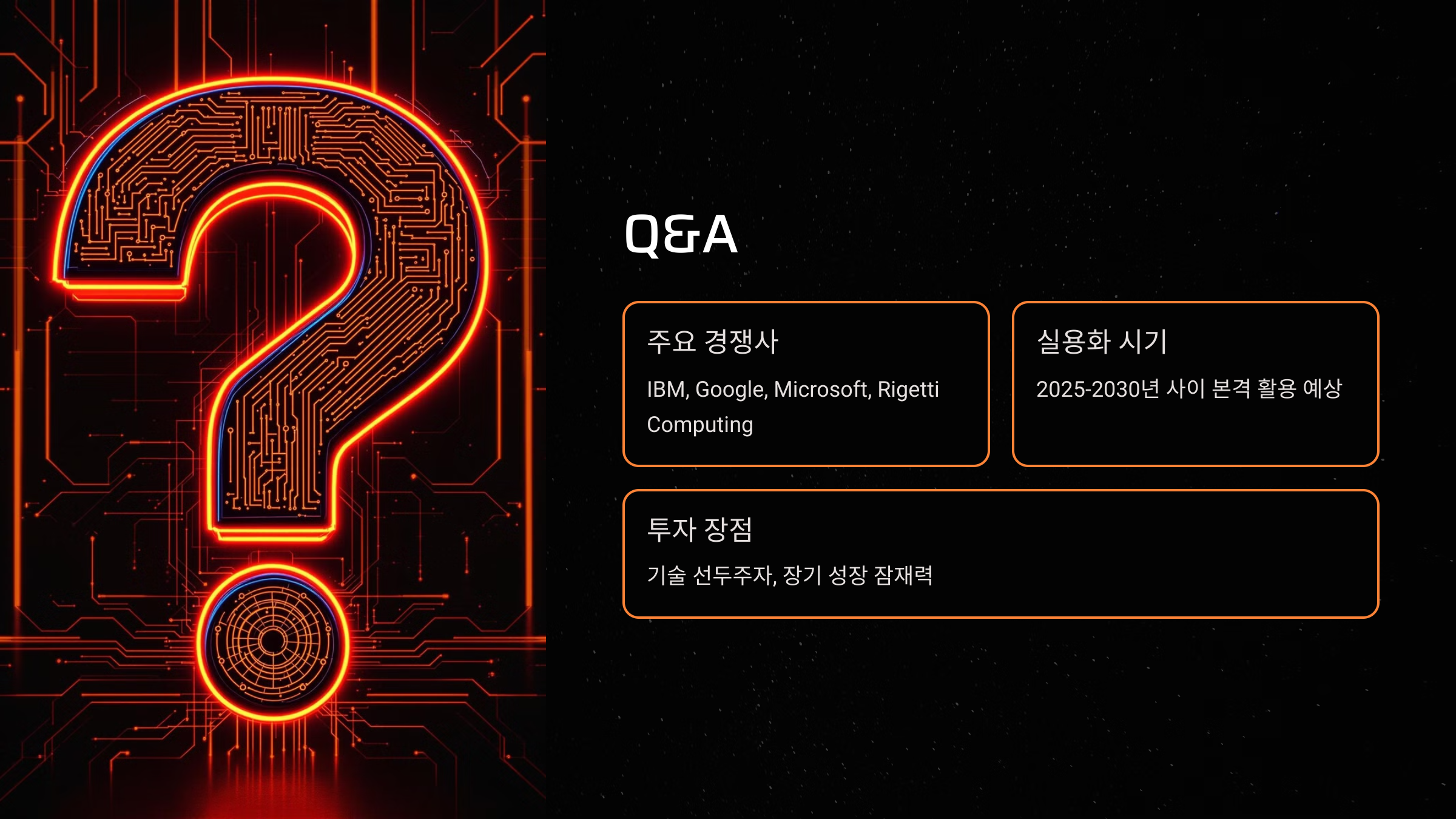 • 장기 투자 관점: 양자컴퓨터 기술의 특성상 장기적인 관점에서 접근하는 것이 중요합니다.