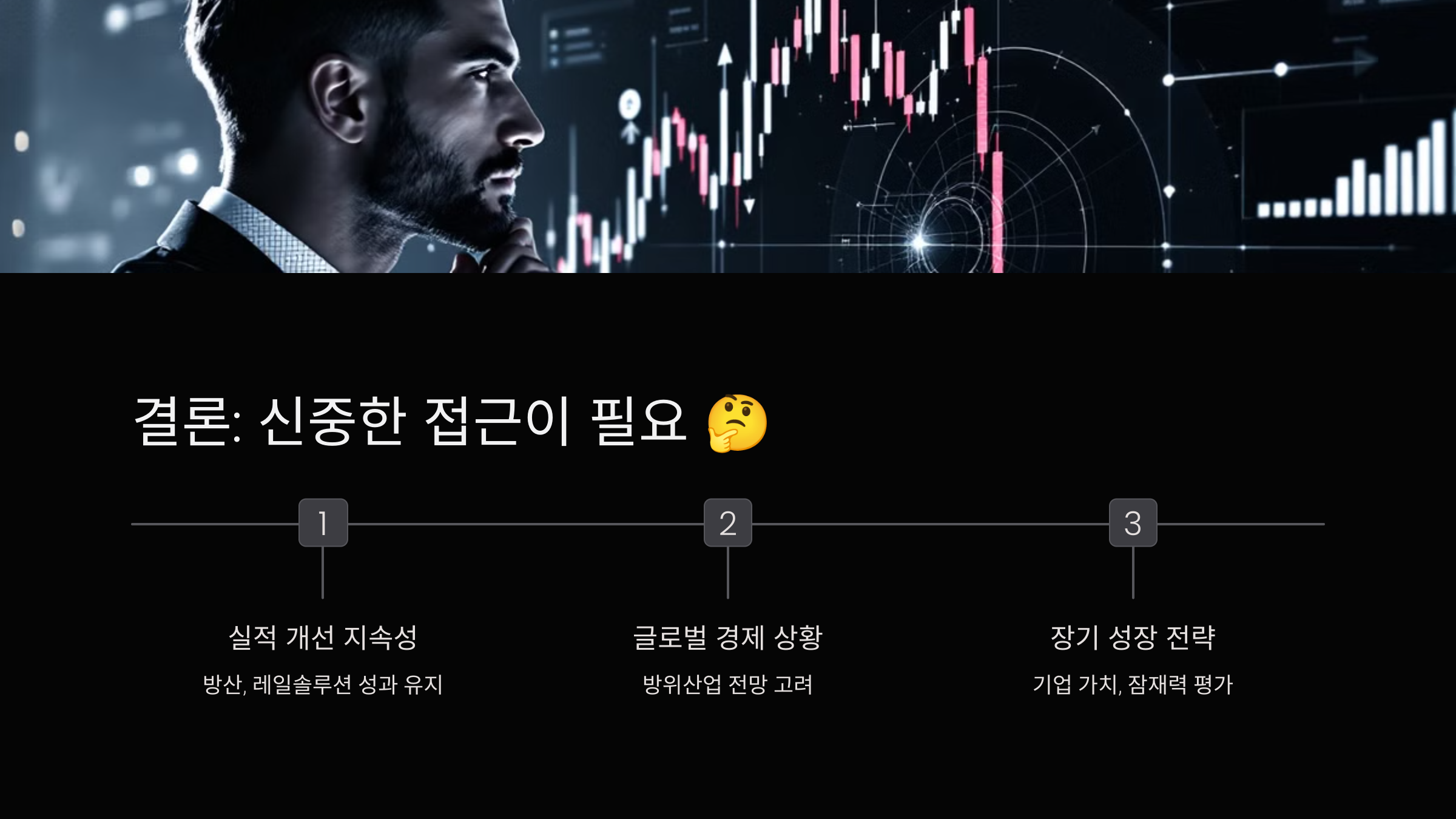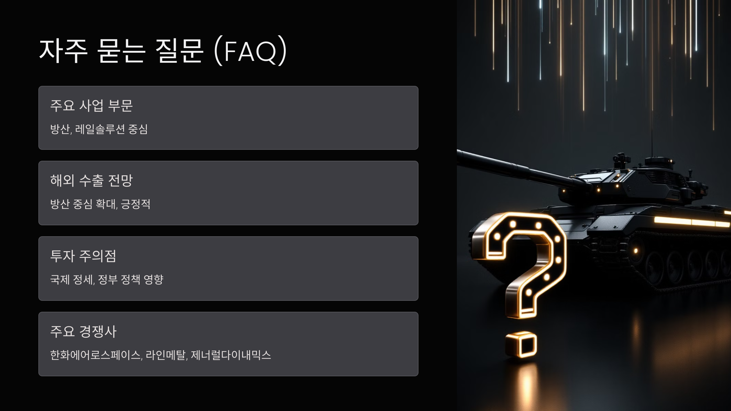 A: 방위산업의 특성상 국제 정세와 정부 정책에 민감할 수 있으므로, 이러한 외부 요인들을 주의 깊게 살펴봐야 합니다.