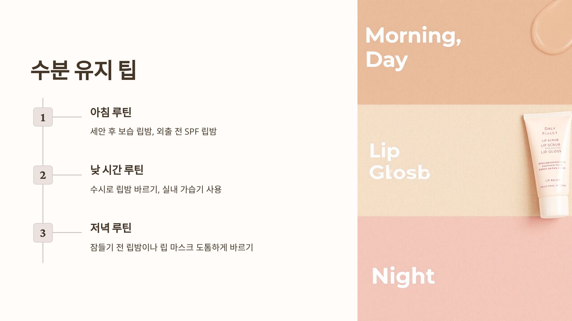 • 입술 핥기 금지: 침이 마르면서 입술 수분이 빠르게 증발합니다.