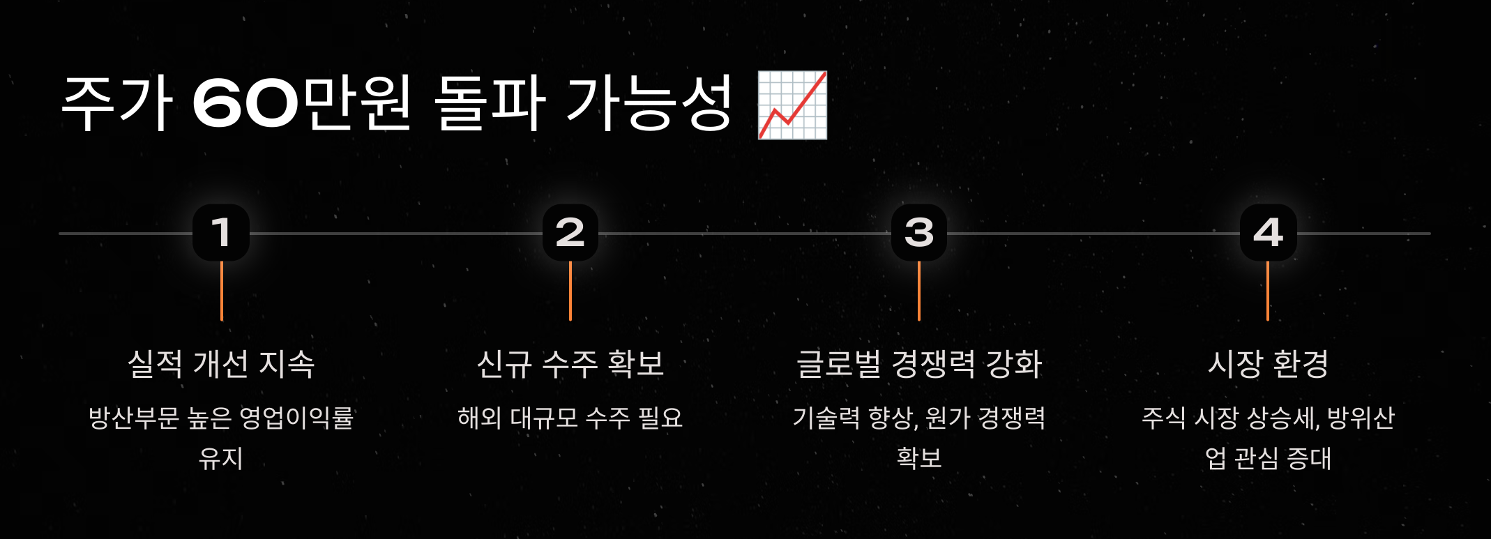 • 실적 개선 지속: 방산부문의 높은 영업이익률이 유지되고, 수출 비중이 늘어난다면 실적 개선이 계속될 가능성이 높습니다.