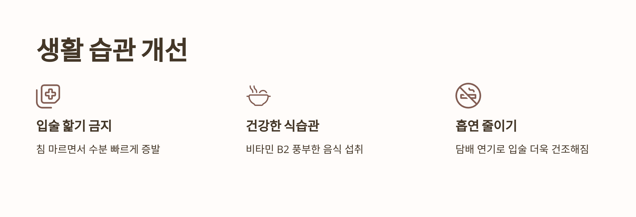 • 입술 핥기 금지: 침이 마르면서 입술 수분이 빠르게 증발합니다.